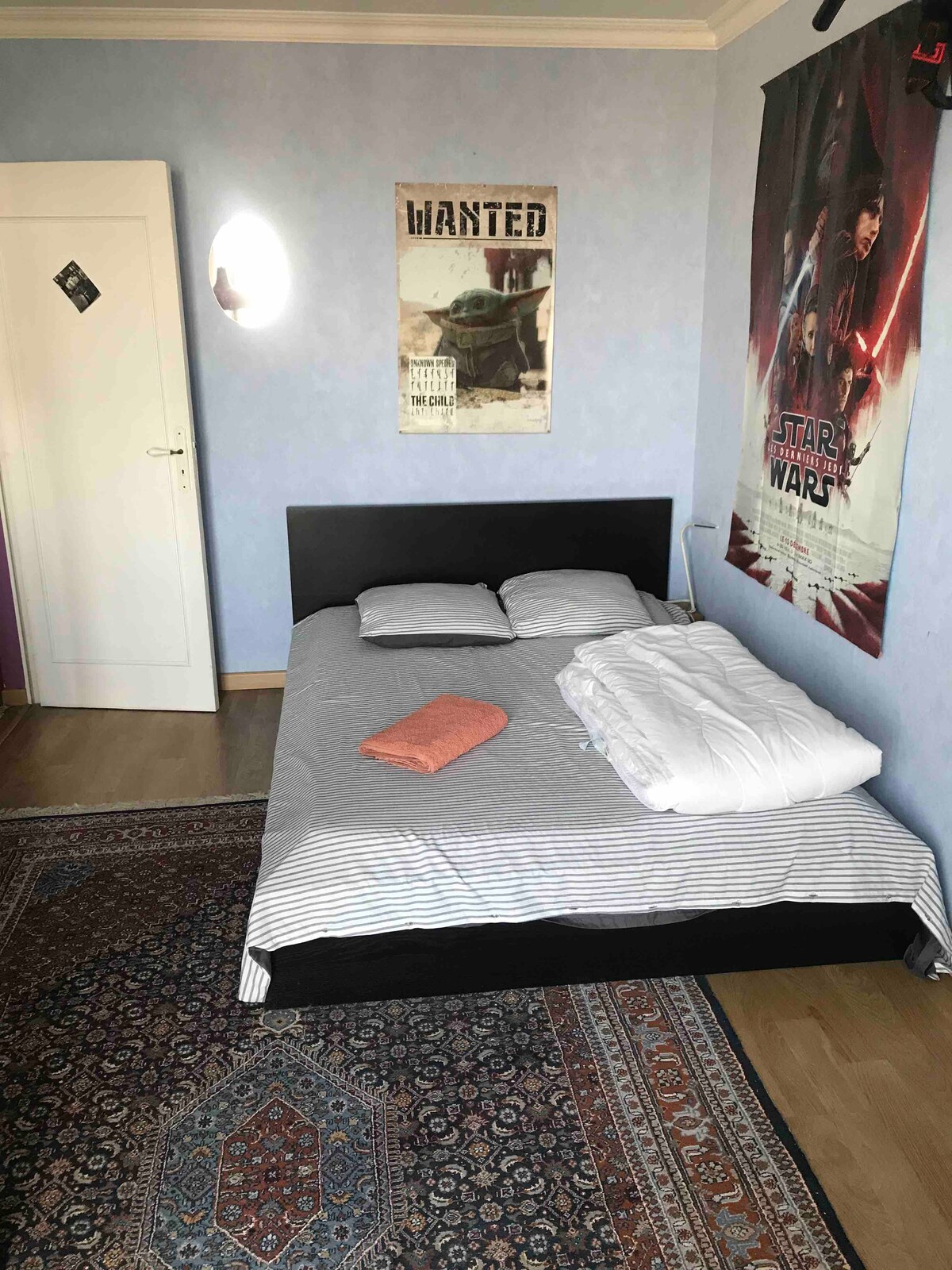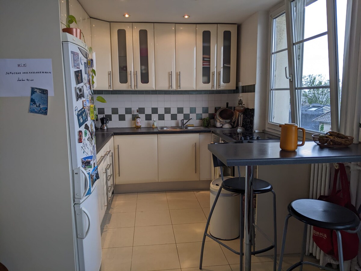 You will be charmed by this peaceful and welcoming room. You will find all the comfort required for a pleasant stay. A comfortable and cozy bed, large wardrobes to store your belongings, a small library, a desk and a television. We will share the kitchen and of course the bathroom. I am a discreet host and I will be delighted to receive you at my place.
