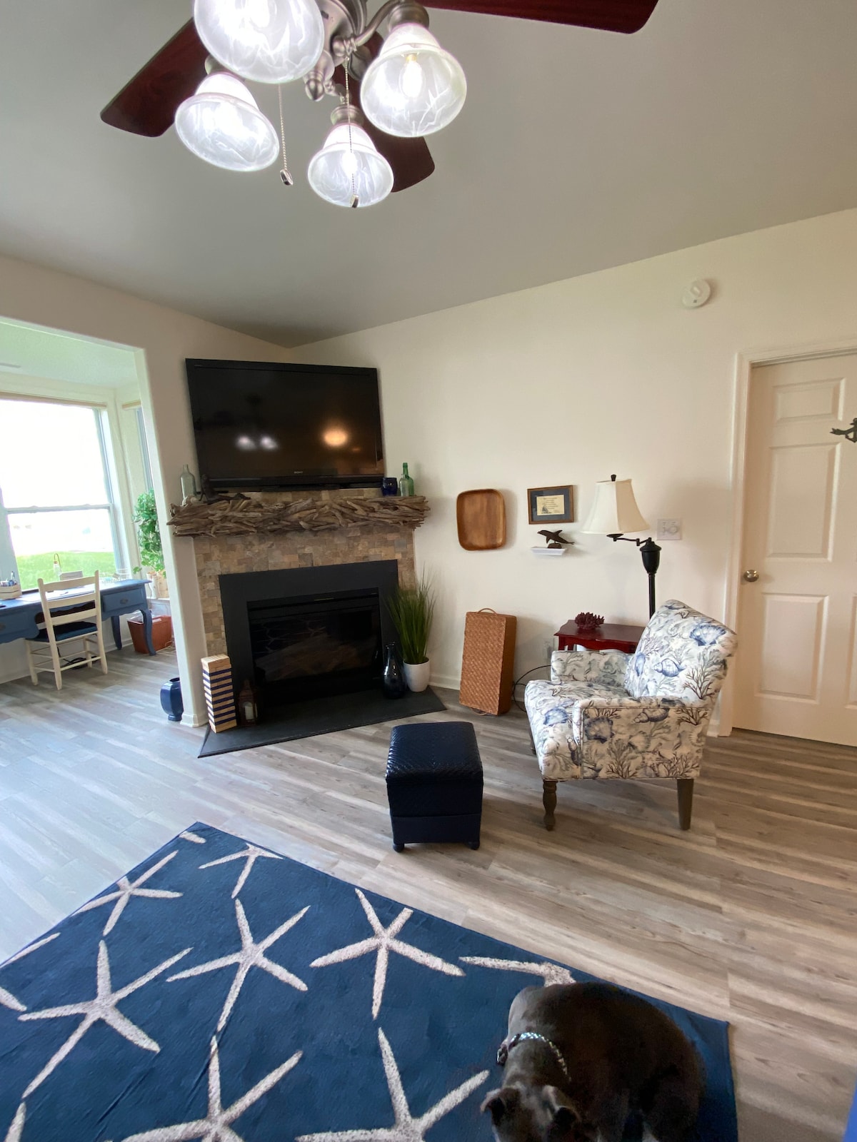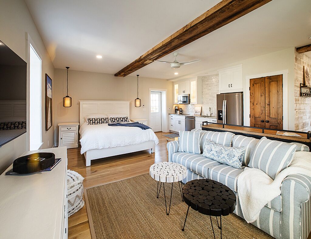 Stepping into our newly renovated stylish suite, you will be awed by the reclaimed wood shiplap cathedral ceiling with original iron trusses, and under your feet, solid wide plank white oak flooring. In the gathering area, you can enjoy the electric fireplace below a solid reclaimed Heart Pine mantel and above that, a large Smart TV. The open layout leads into a large full kitchen offering an 8’ granite-topped island with 4 counter stools, accented by 2 beautiful nautical pendant lights. The kitchen is stocked with all of the amenities you would possibly need. The appliances include, a large side-by-side refrigerator with ice maker, an induction cooktop/range, microwave, a full size dishwasher, and kitchen disposal. In your dining area you can enjoy a solid reclaimed pine dining table, custom made by Old Wood Delaware, which seats 6. You’ll appreciate all of the accent lighting throughout, that enhances the ambiance of the space. Entering the area of the bedroom, you’ll notice details beyond your imagination featuring a stunning fully custom tiled designer bathroom including a floating granite-topped vanity, highlighted by under cabinet lighting and a backlit mirror. The bathroom is stocked with body soap, shampoo/conditioner, and luxury towels. As you enter the bedroom you’ll marvel at the hand inlaid wood starburst custom bed dressed with high-end linens. The room is accented by the reclaimed wood shiplap wall, full mirrored closet doors, and you will also enjoy while relaxing in bed the large smart TV.