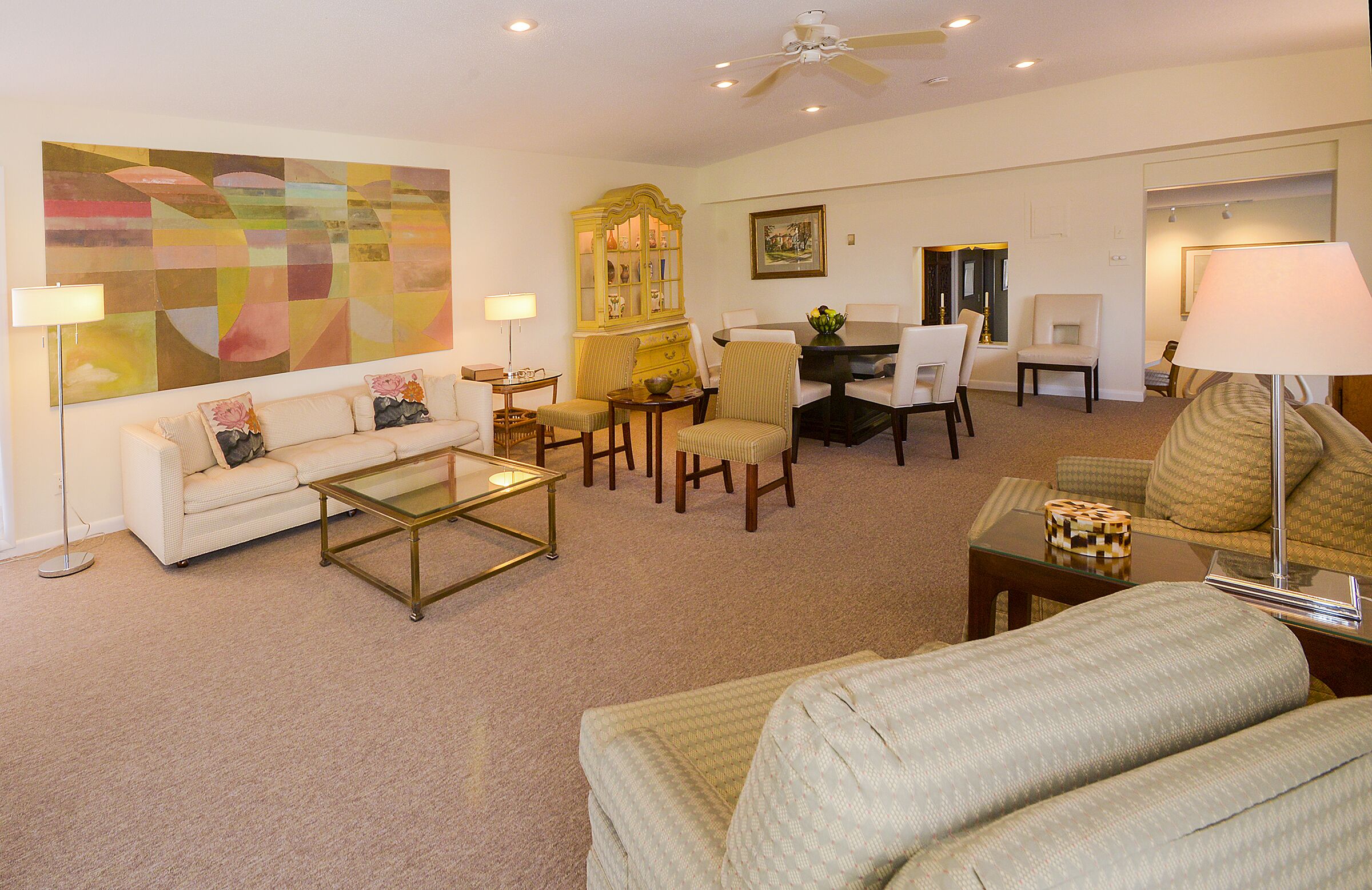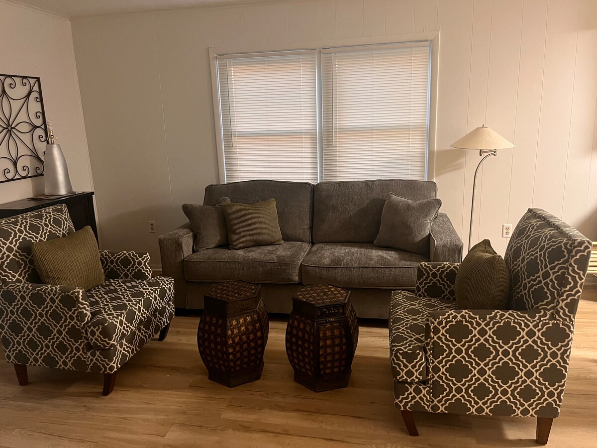 Kitchen, Dining and Living Rooms open floor plan. Master bedroom (queen) and 2 additional bedrooms (1 full and trundle bed-2 twins). 2 full bathrooms with bathtub/showers. Sunroom and covered patio in back on a sprawling lawn with pond and fountain. Plenty of open free parking. Lovely pool area across the driveway.