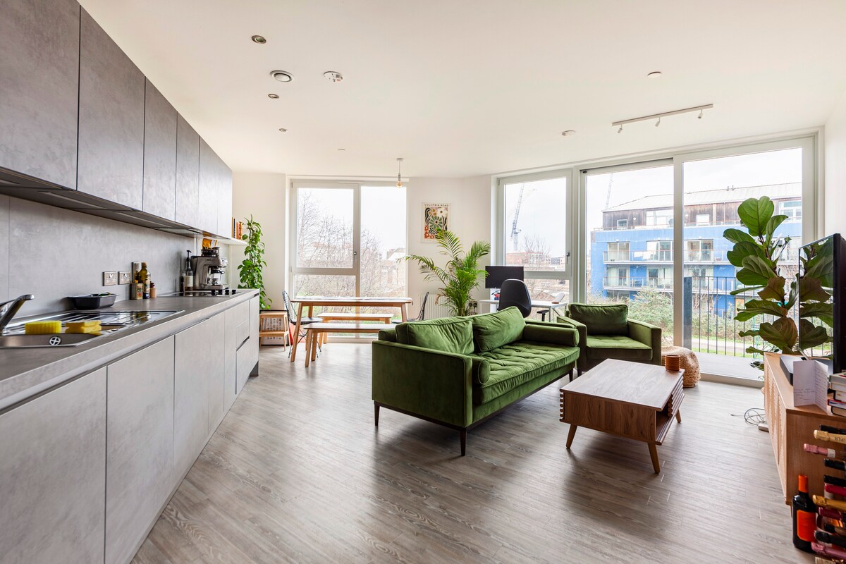 The living room area features a fully equipped kitchen, a dining table for six, a three-seater sofa, and an armchair. Plus, the private balcony boasts stunning views of both the public pathway and the iconic London Stadium.