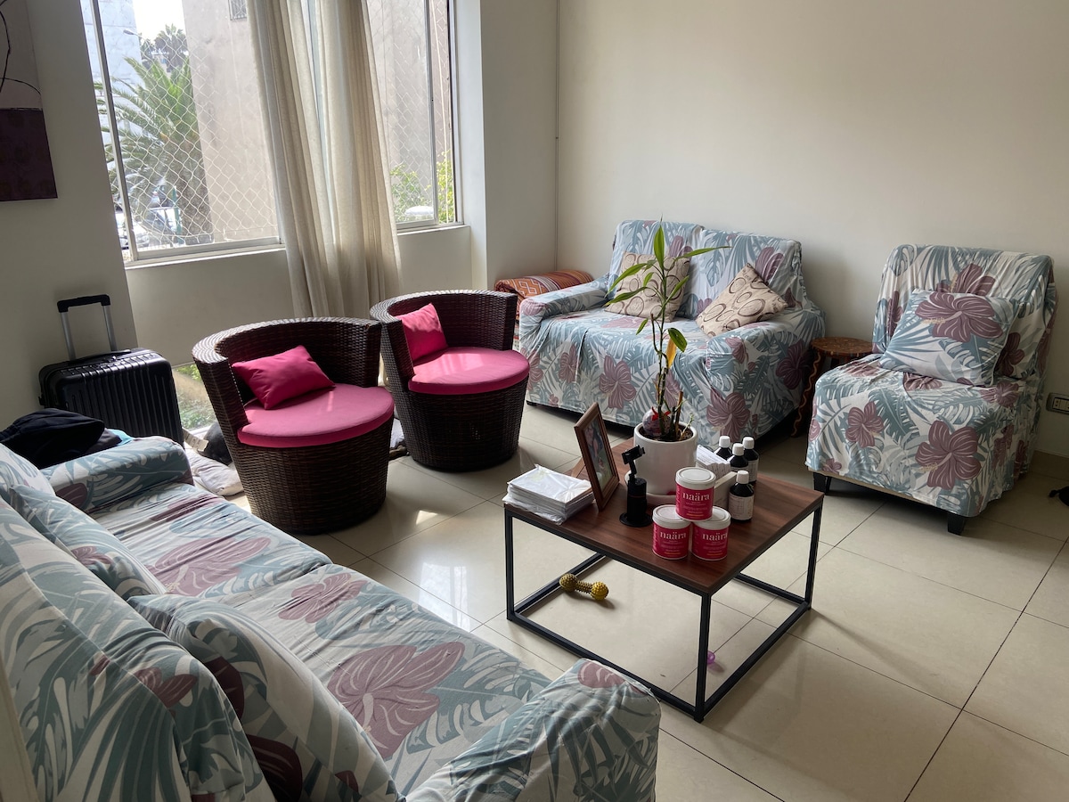 Our amazing, comfortable, central and private room is located within our family apartment, in the center of Miraflores, one of the most touristy and beautiful districts of Lima. It has its own bathroom and a door to the side that faces the street, super safe five minutes from the Metropolitano (train) and the beach, one block from two supermarkets, banks, shopping centers, art galleries, gyms and the best restaurants.