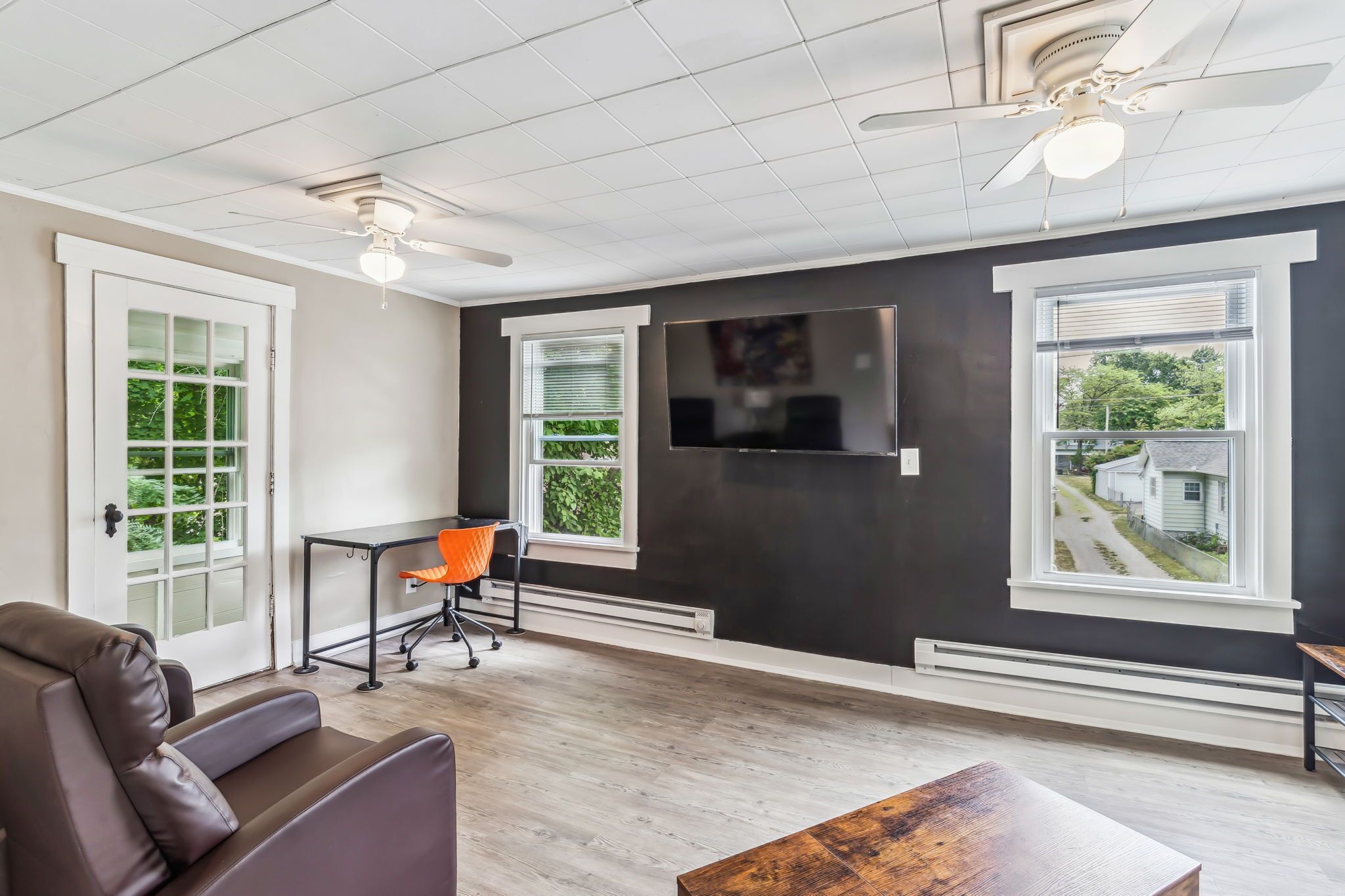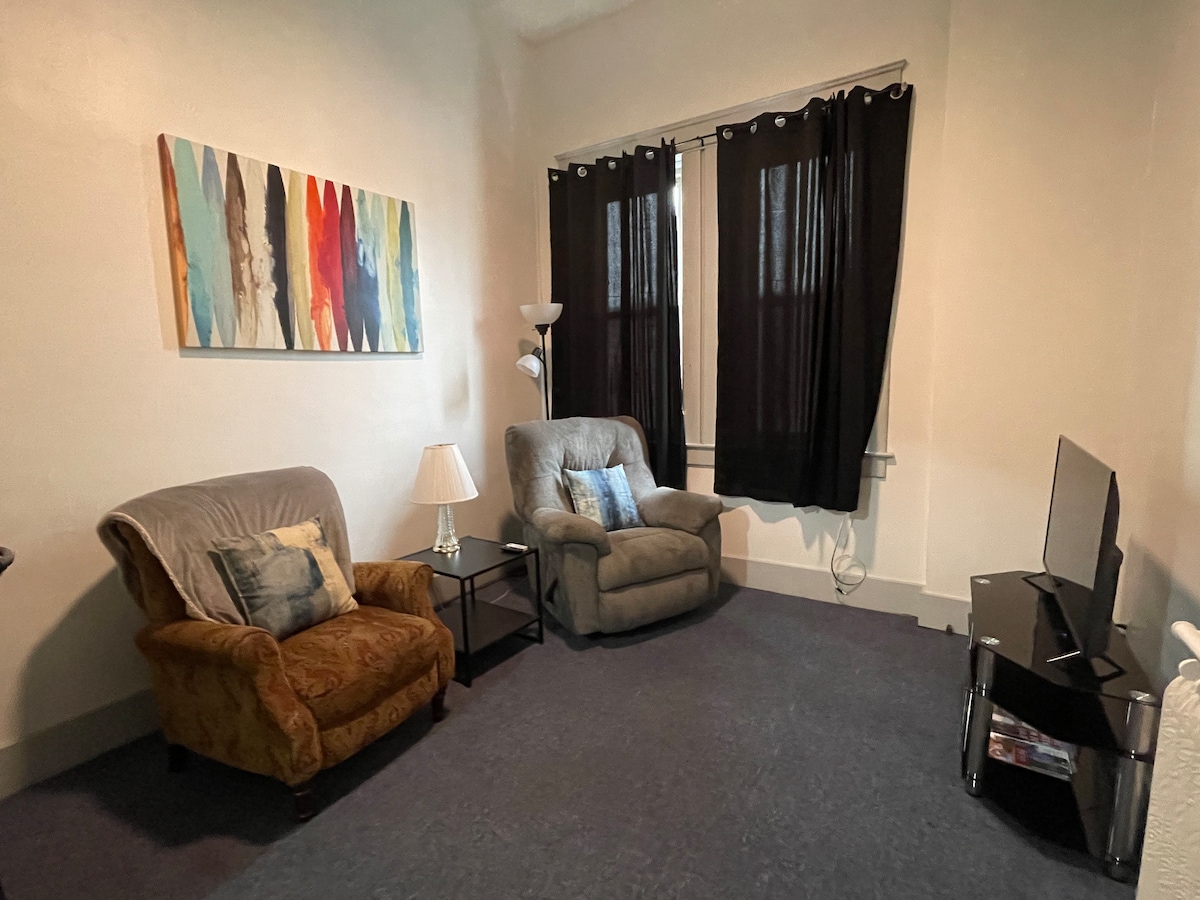 Whether in the area for a short or extended stay this is a great alternative to a typical hotel room. This second floor suite, offers you your own private room and bathroom. The room features period furnishings with a queen size bed with a comfort mattress, 8 drawer dresser, 2 night stands, standard 2 door closet, overhead ceiling fan and a new 32” Samsung smart tv. Complimentary coffee, tea & water is available during your stay.