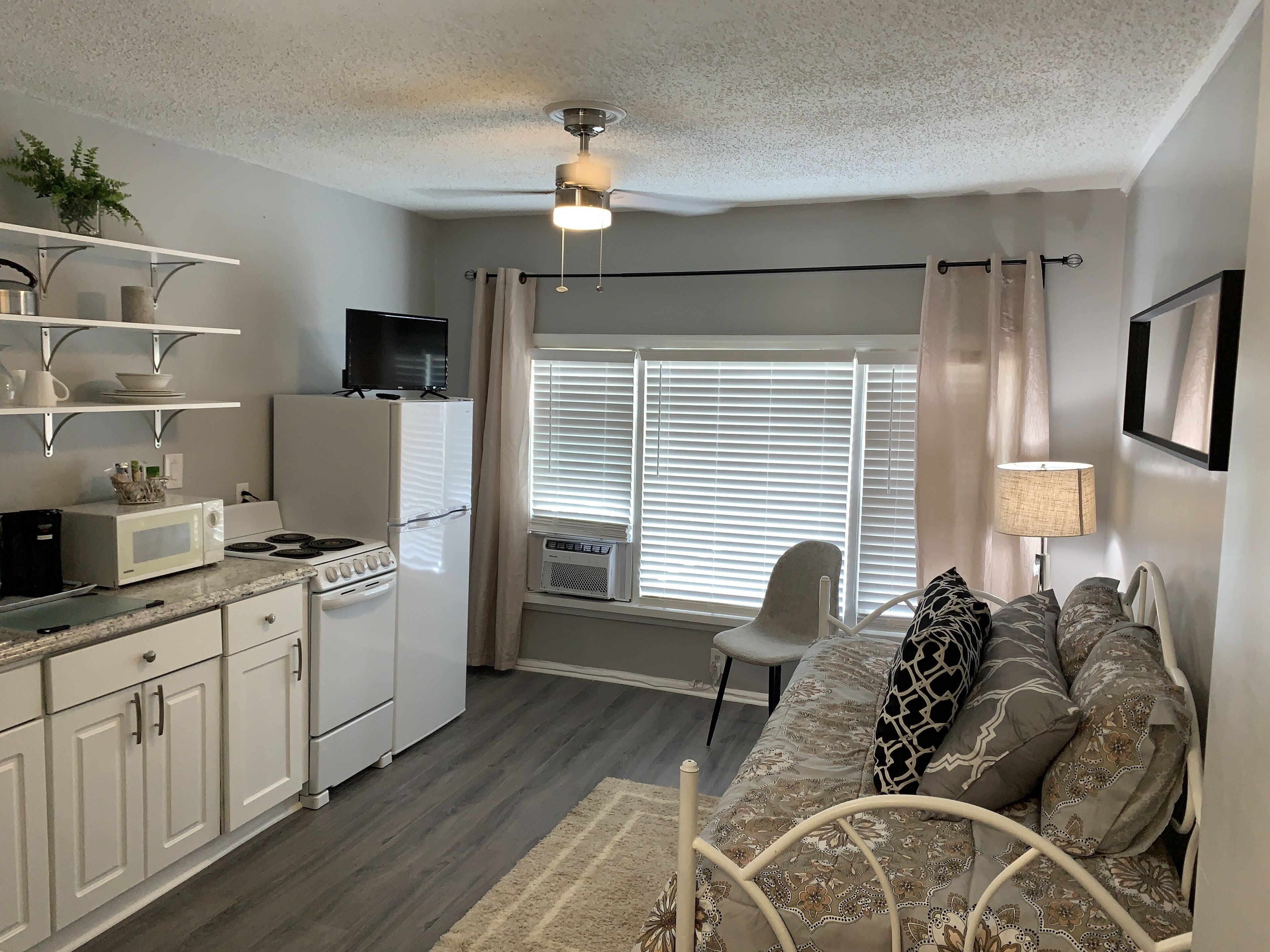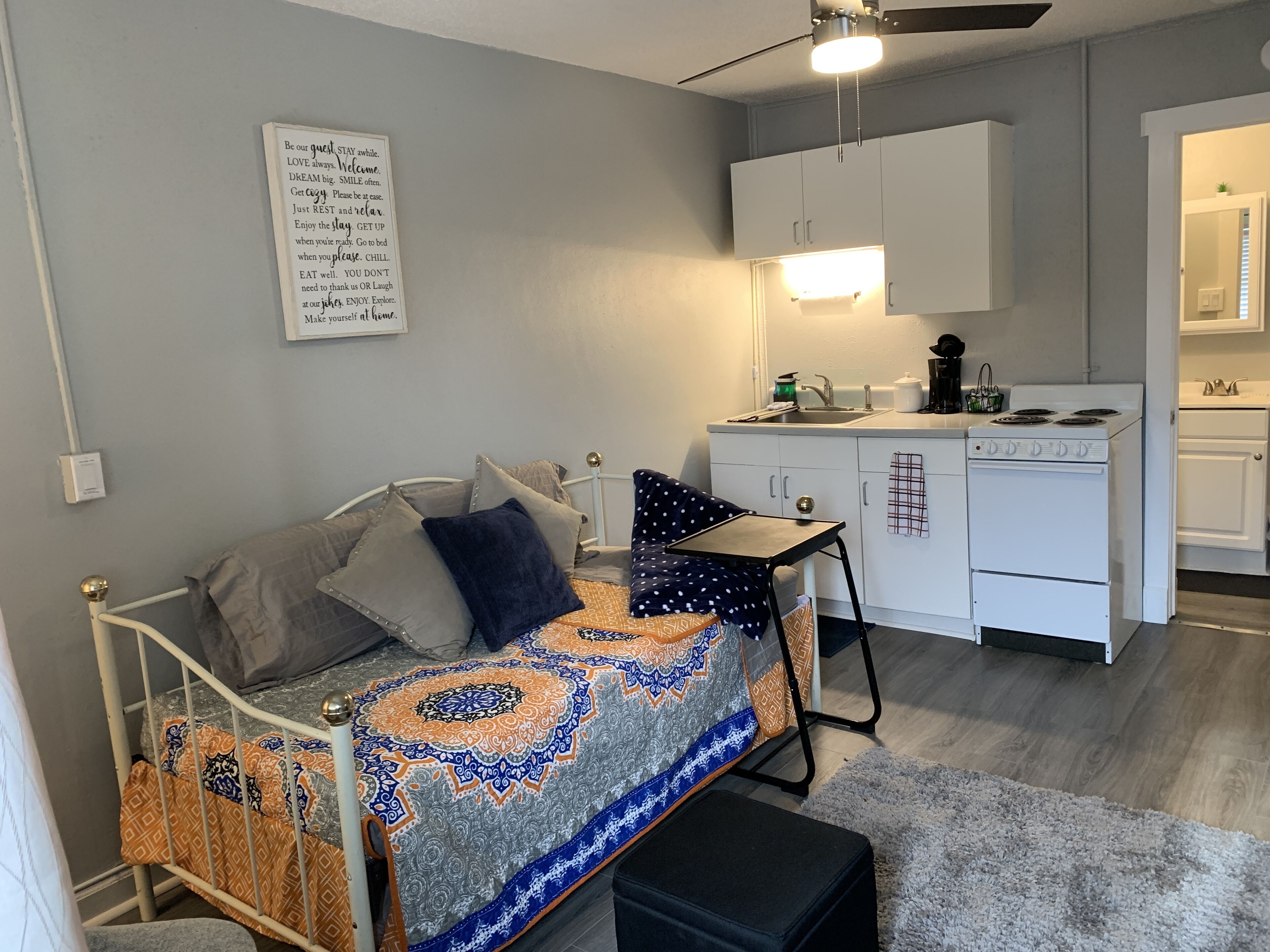Updated, fully furnished apartment with super comfy living room, bedroom, kitchen, dining room, restroom, and laundry facilities.