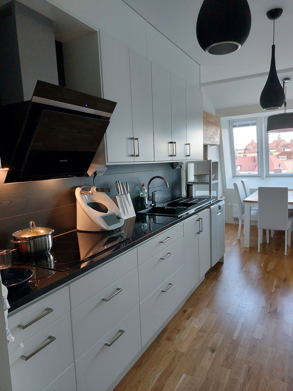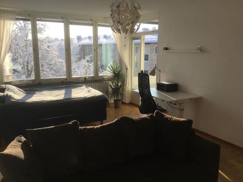 Overlooking the biggest market square of Linköping. Not quite your own apartment -- the kitchen and open air sundeck is shared. You are welcome to use any spices or cooking oils you find.