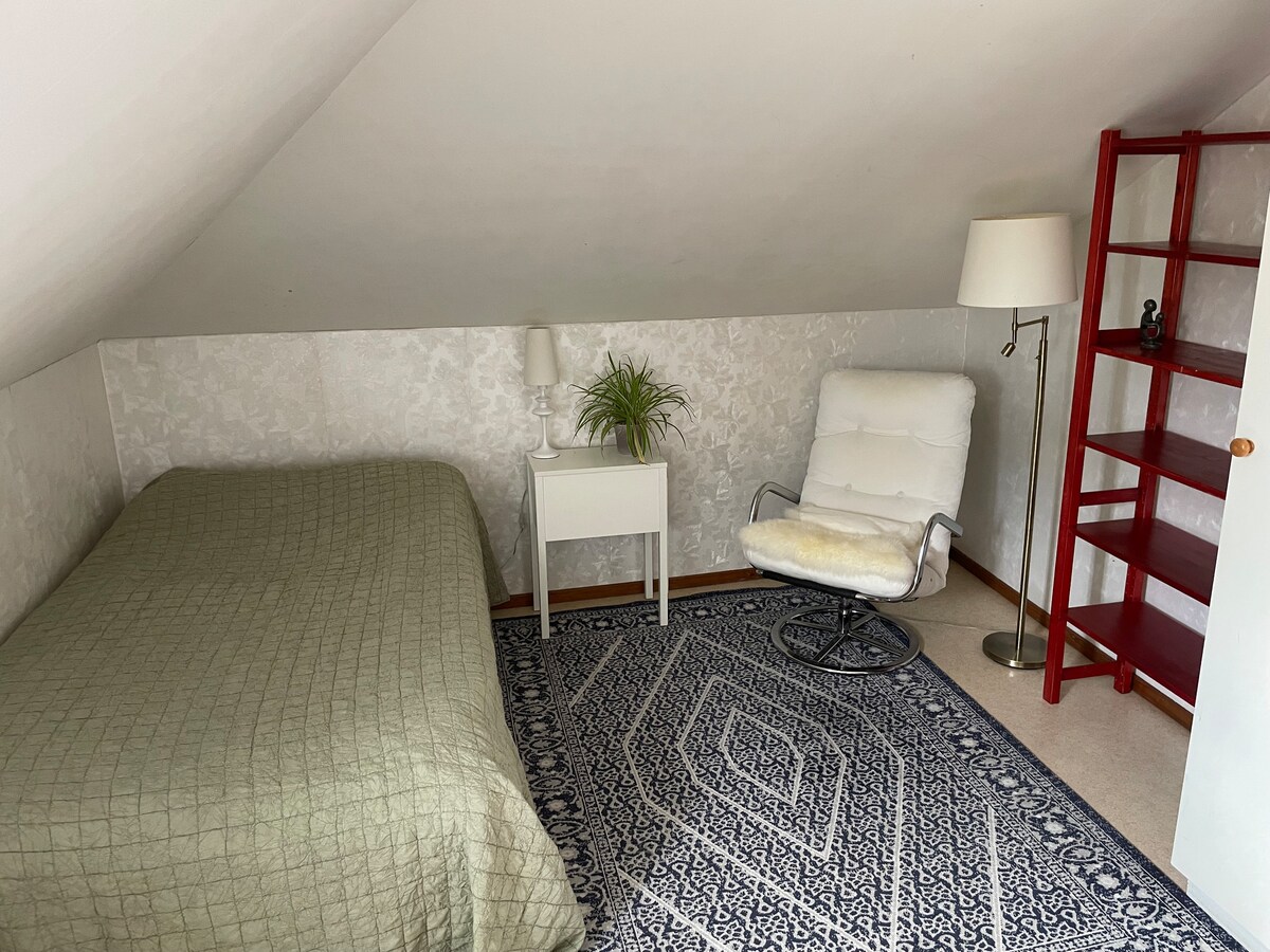 Cozy attic apartment in old mission house/church from 1912 with access to lovely garden. Proximity to the city center, the travel center, the airport and several sights (about 15 minutes walk). Also several larger employers such as SAAB and the University Hospital are close by. Access to patio, barbecue, laundry and musical instruments (by appointment). The hosts live in the house and organize cultural events in the church hall/living room once a month.