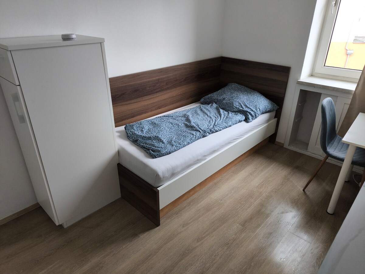 The approx. 11m² single room offers a wonderful view to the Postlingberg. It is fully furnished. The lockable private room is equipped with a desk incl. swivel armchair and a Queen Size bed (140/200) with a comfortable pocket spring mattress and storage space.