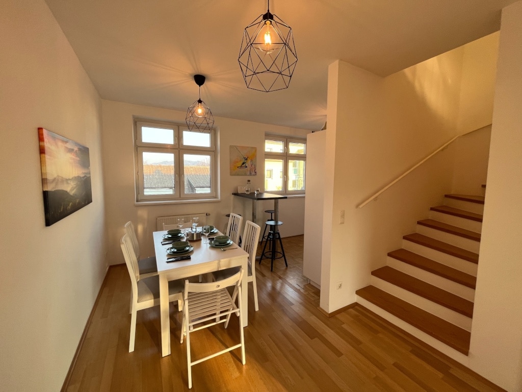 The quiet and bright attic apartment is split over two floors including a rooftop terrace. It is located very close to the river and has an amazing view at the Pöstlingberg. The loft-like layout offers a great way of living, with a cosy communal kitchen and a beautiful roof terrace overlooking the rooftops of uptown Linz. The apartment has been decorated in a modern style and with a full equipped new kitchen, a storage room with a washing machine and a modern bathroom with separate toilet.