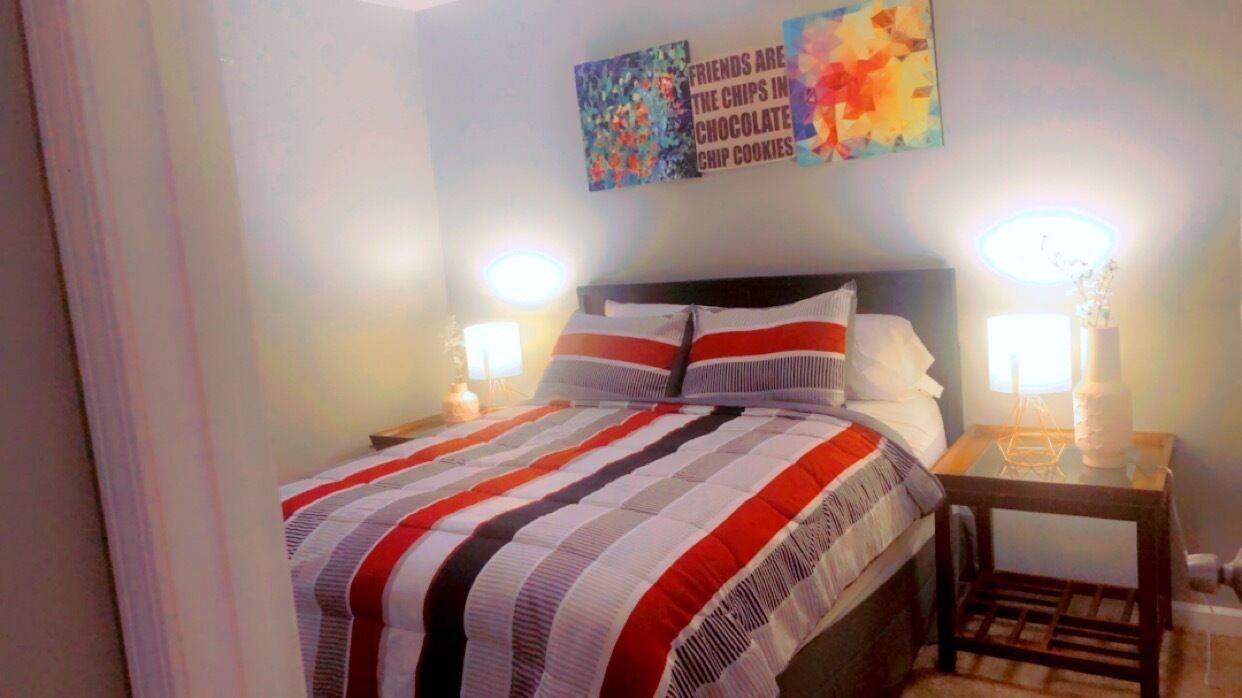 Cozy 2-bedroom, basement apartment one-bath, full kitchen vacation rental is in a quiet suburban area. Owner lives upstairs. Enjoy work friendly, free WiFi, 3 Smartscreen TVs, laundry, Ninja blender, air-fryer, Keurig with coffee, hairdryer, iron/ironing board, linen, comforters, towels, dishware, flatware, toaster, dining tables, keyless entry, ceiling fans, complimentary toiletries, cooking basics, trash bags, paper towels, toilet paper, Ring doorbell, free parking, heat, and air conditioning.