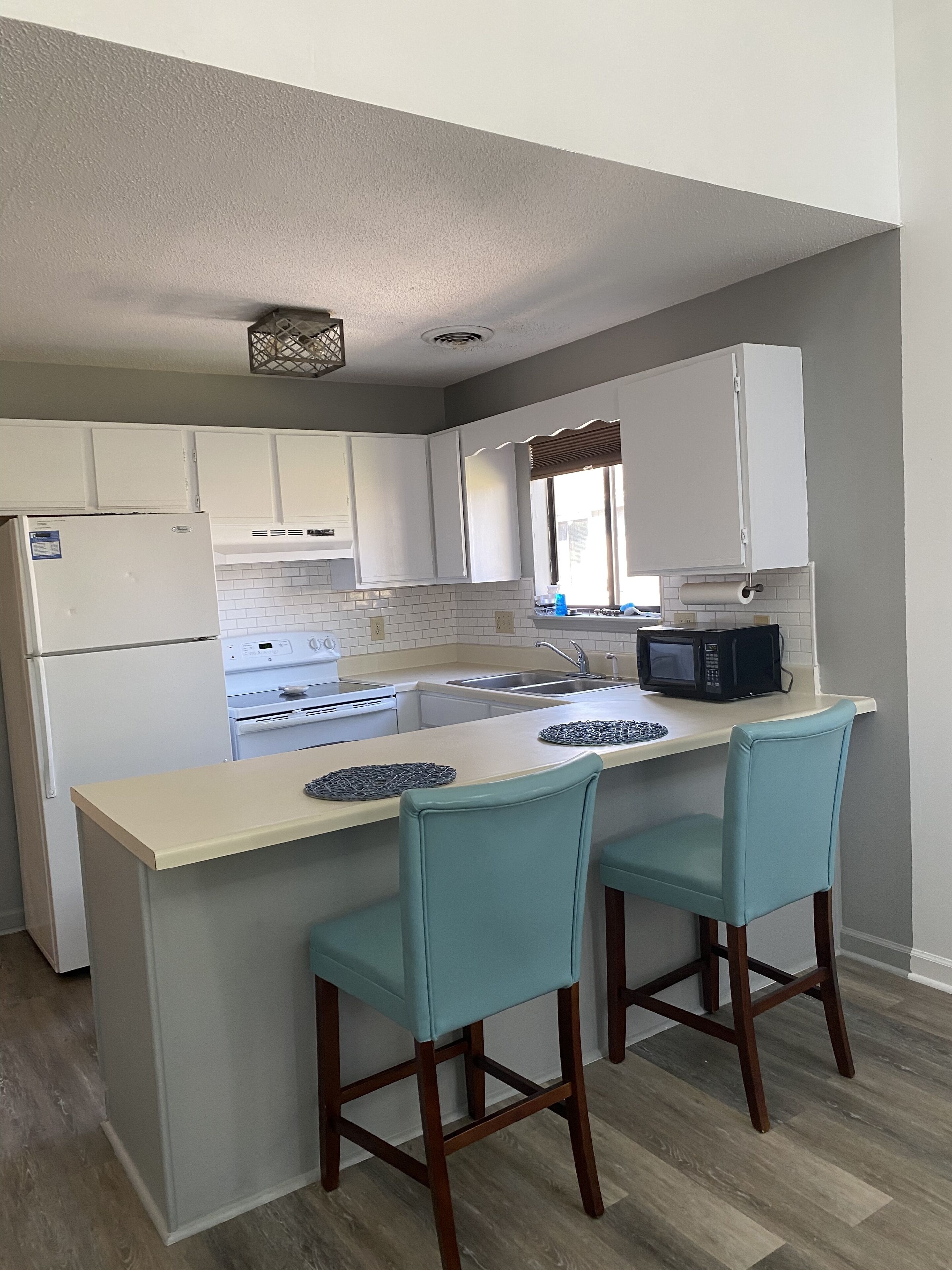 Making our way into the condo, guests will walk down the main hallway and find the kitchen. This room is equipped with full sized appliances including a stove and oven, mounted microwave, refrigerator, dishwasher and sink. Plenty of cabinet space and granite counter tops make this space perfect for preparing a meal! All of our homes come with fully stocked kitchens! For those who prefer to dine out, Doordash and UberEats have became increasingly popular in this area! This wrap around kitchen also includes an opening that faces the living room and 4 barstools! Guests will also find the washer and dryer in the closet across from the fridge.