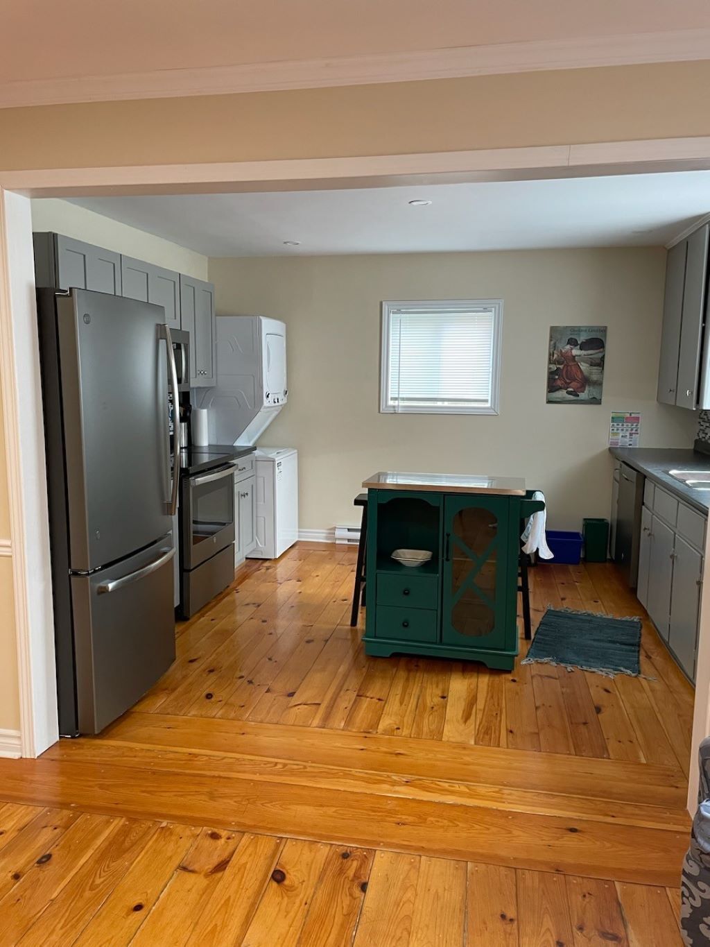 • Newly renovated kitchen with new cupboards, stainless steel fridge, oven/range, microwave, coffee maker, electric kettle, toaster, pots & pans, utensils and dishes for dining in. Eat at counter with stools