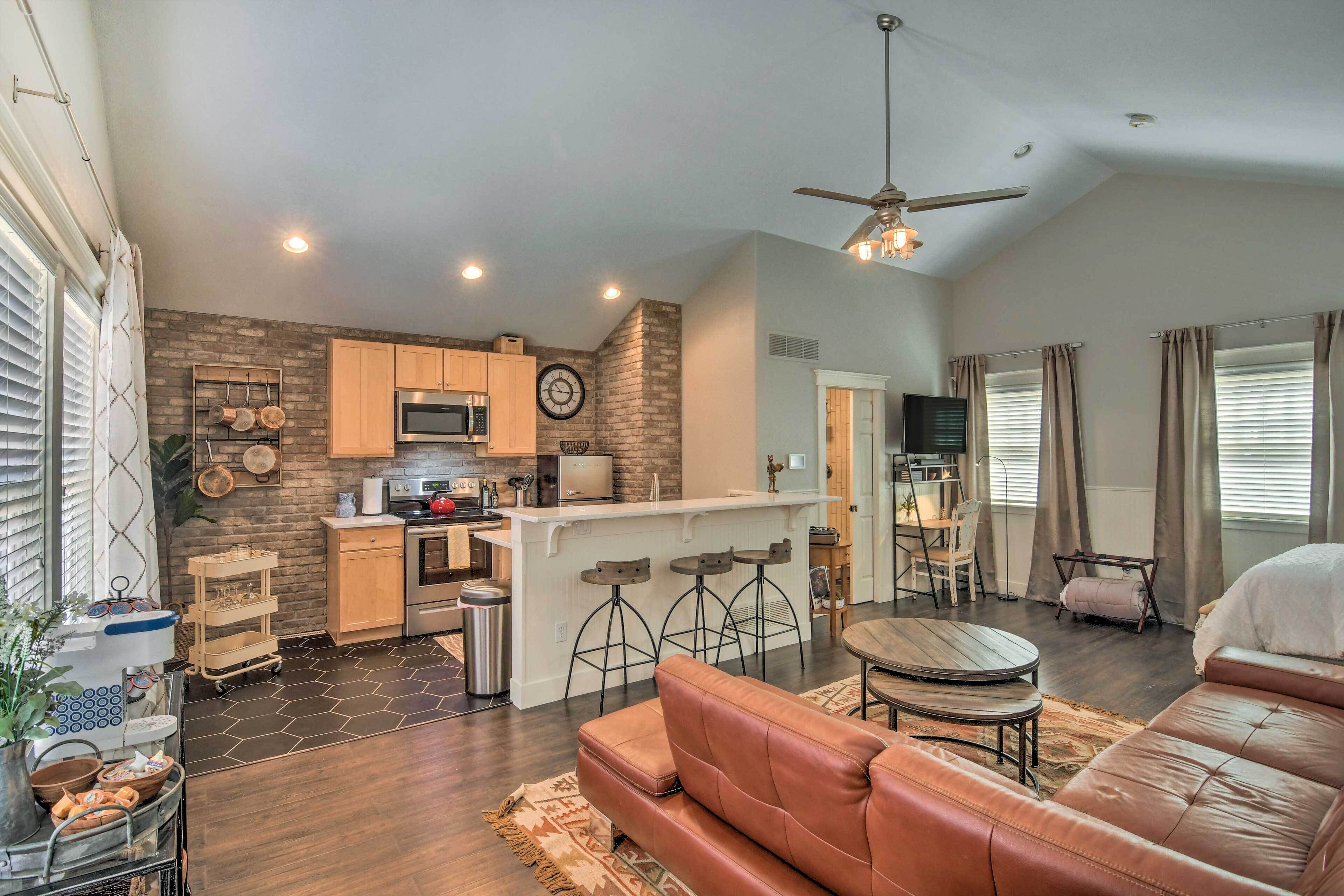 Sectional sofa can provide additional sleeping area. Fully outfitted kitchenette with Keurig, blender, microwave, toaster oven, bar sink, new washer/dryer unit. There is private outdoor dining space with an infrared gas grill. Main bedroom has a large walk in closet. Living area has 42” flat screen tv and an additional tv in bedroom. We have exterior security cameras for the protection of our home and guests. These do not record sound and are not in the interior of the suite.