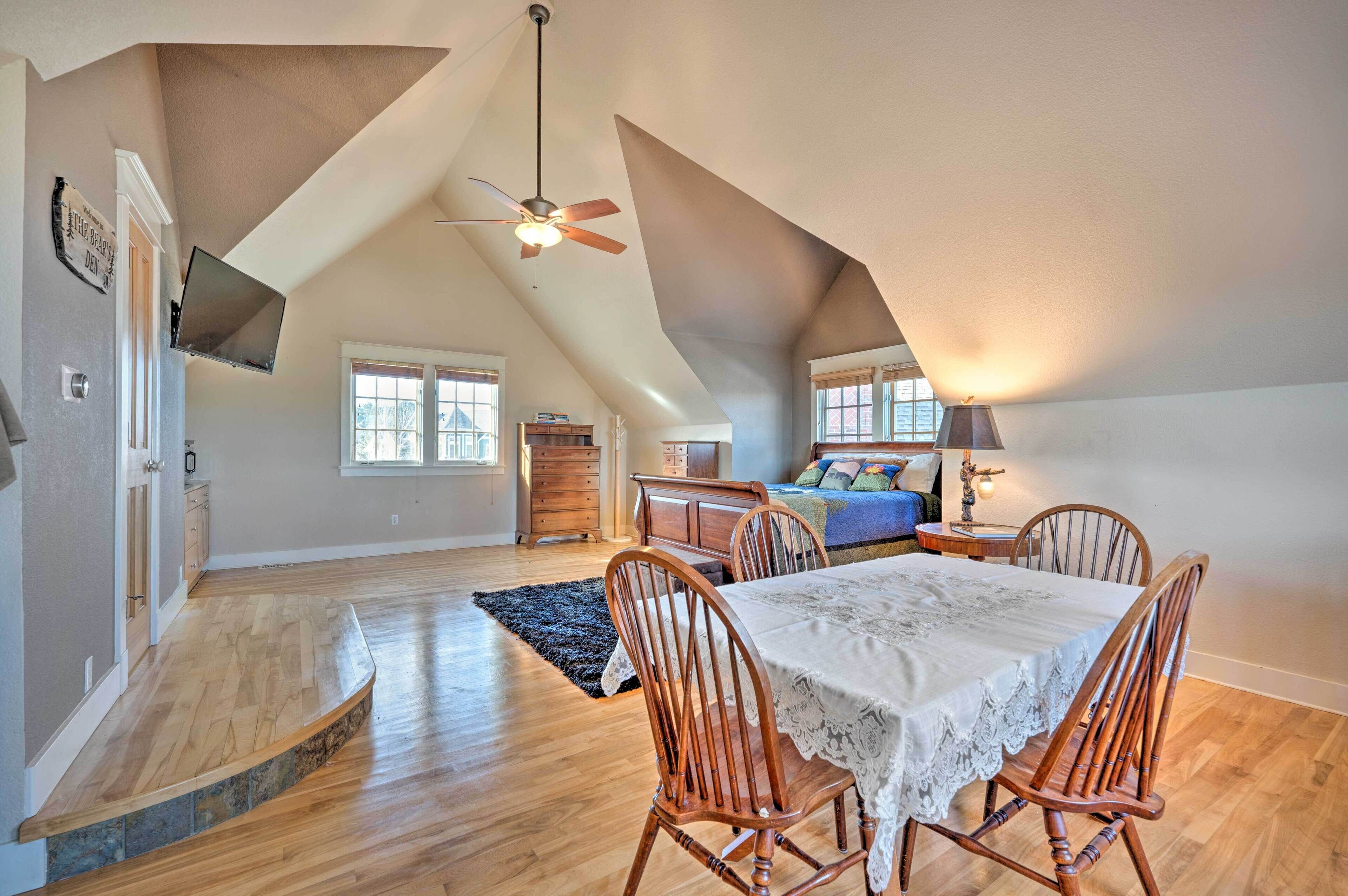 The Carriage House is situated above out detached garage with a private entrance. You have access to the entire space.