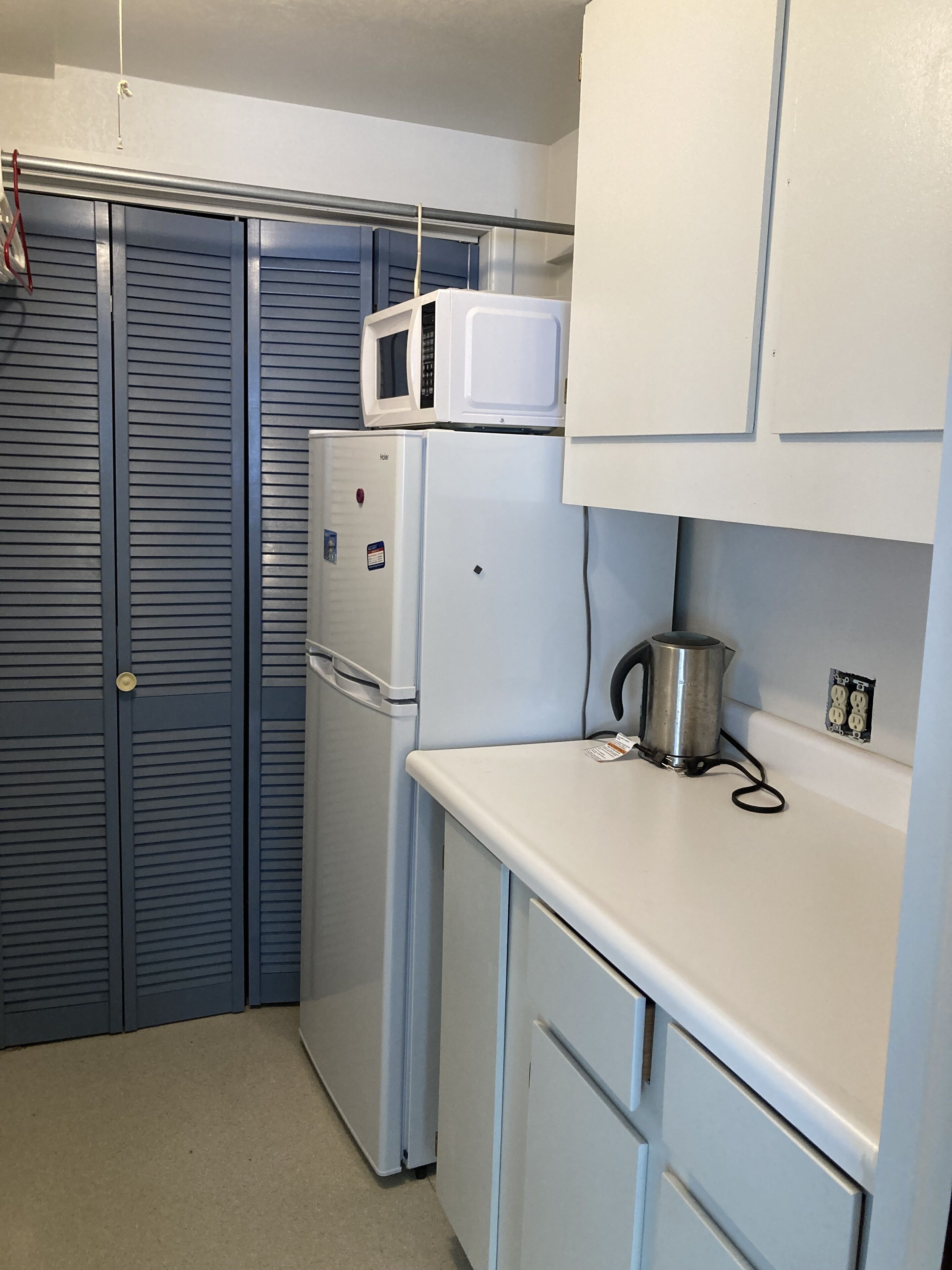 There is also a eat in kitchen area which has a dining table, fridge, and a variety of plug in appliances for cooking as well as coffee & tea or bar set up.