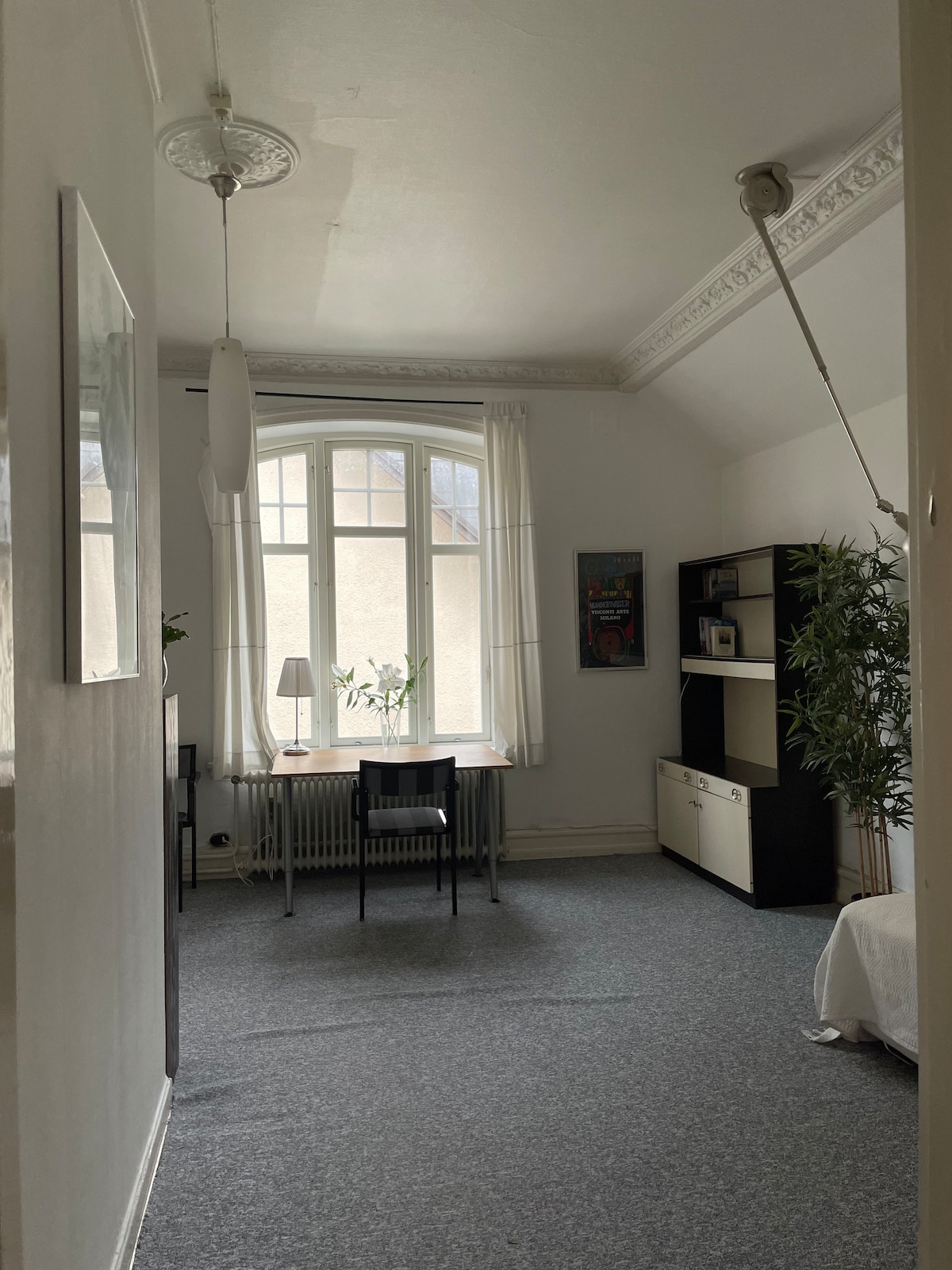 Your room is 20 square meters, plus large built-in wardrobes, a large window facing southeast to our garden, making is very quiet, despite its extremely central location, next to Martenstorget in the very center of Lund.
