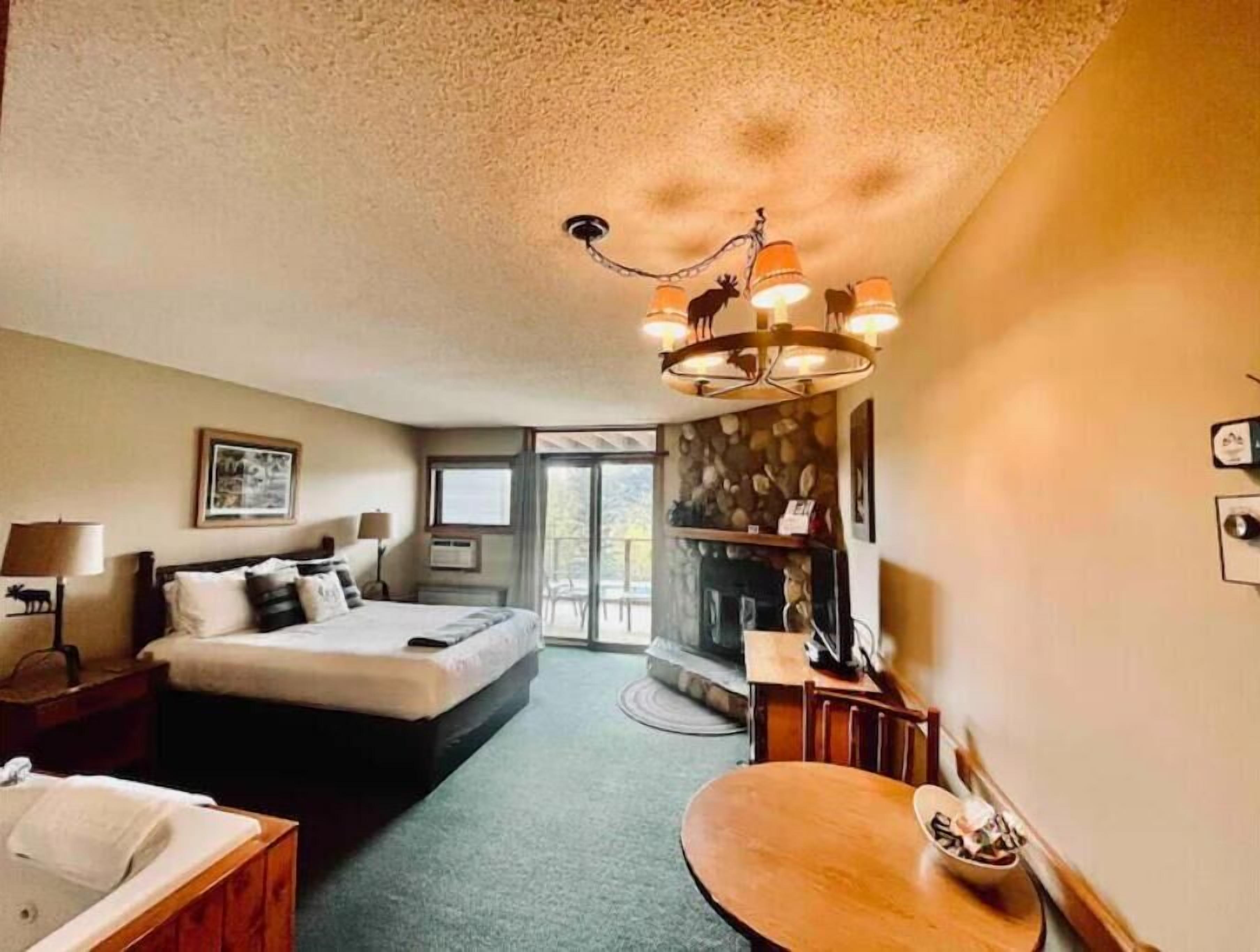 But the magic doesn't end there. After a day filled with outdoor fun, retreat to your private suite where relaxation takes center stage. Immerse yourself in the rejuvenating waters of your very own whirlpool tub, all while gazing out at the majestic Moose Mountain. Warm your heart and soul by the wood-burning fireplace, and prepare your favorite meals in the fully-equipped kitchen. Step out onto your spacious balcony to savor the crisp mountain air and the beauty of the surrounding wilderness.