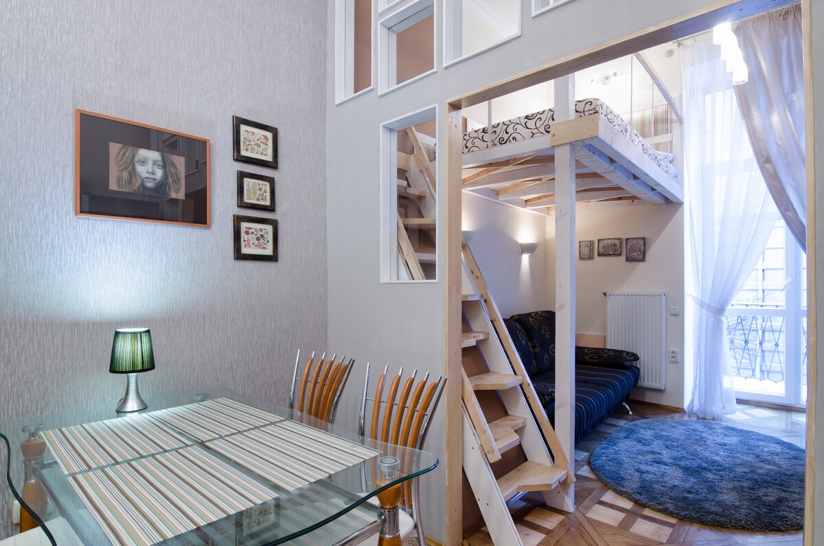 Light mansard studio with a parking space in the very center of the city - a 3-minute walk to Svobody Avenue. Another 4 minutes and you are already at Rynok Square. The apartment is small, but equipped with everything you need for both short and long stays