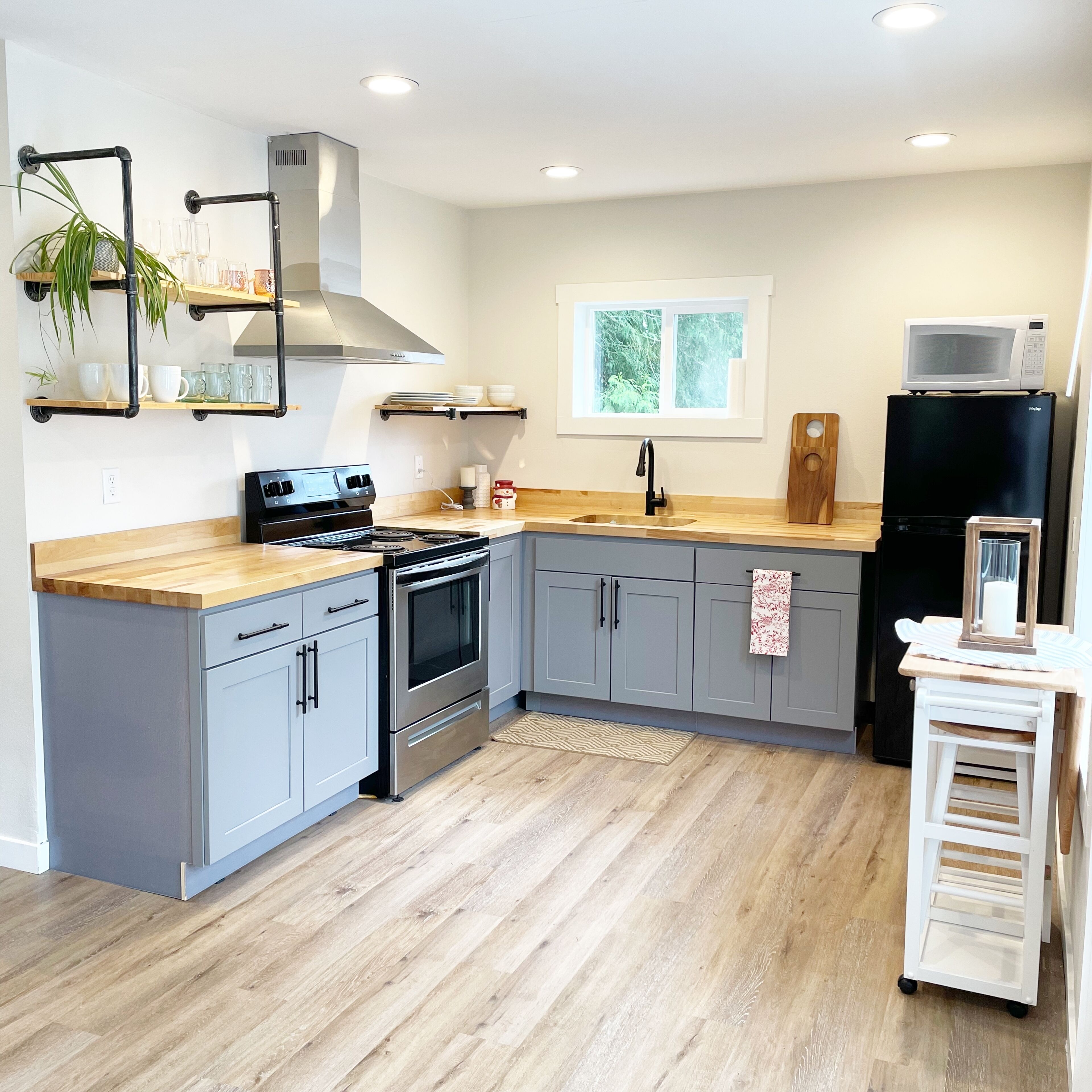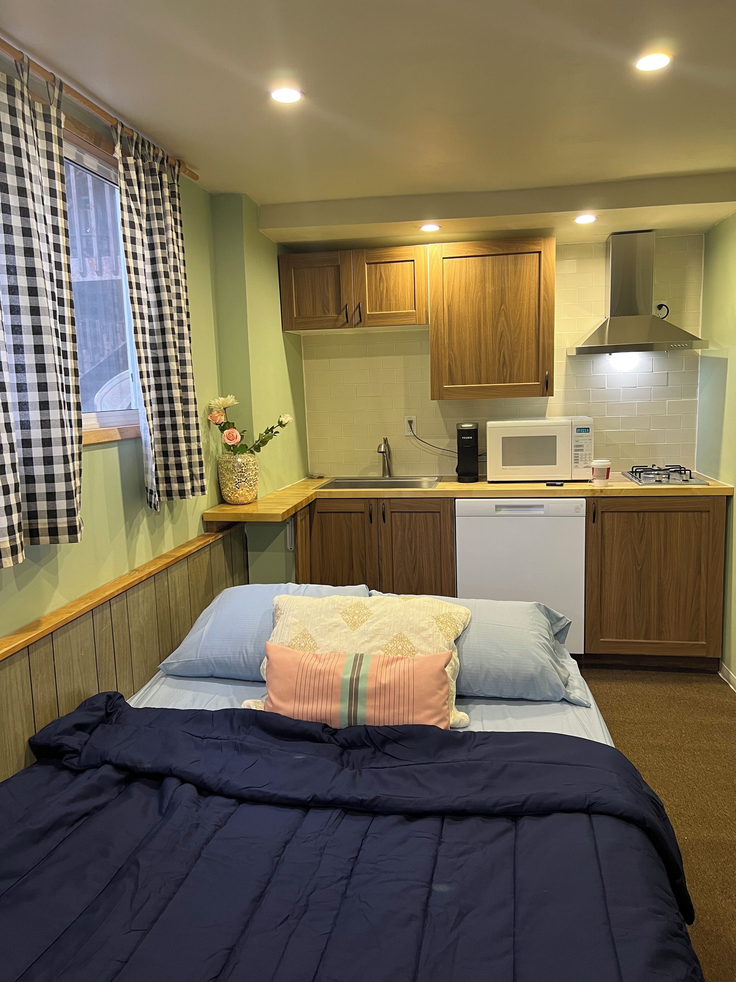 KITCHENETTE: Cooking basics, 2-burner stove, microwave, mini fridge, dishware & flatware, tea kettle