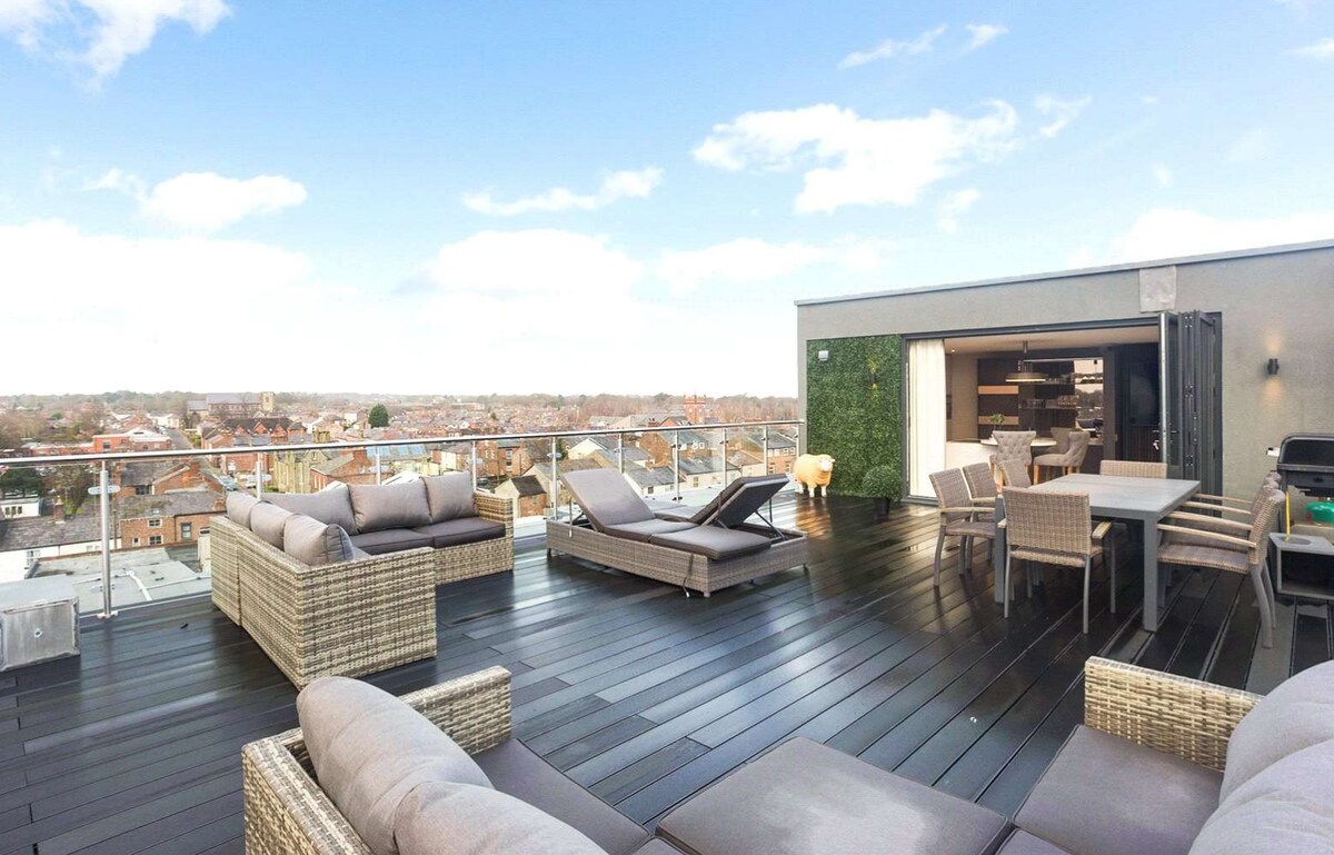 Inside, the penthouse has two double bedrooms, two bath/shower rooms and an open plan kitchen/living/diner, opening out onto the roof terrace via bifold doors.