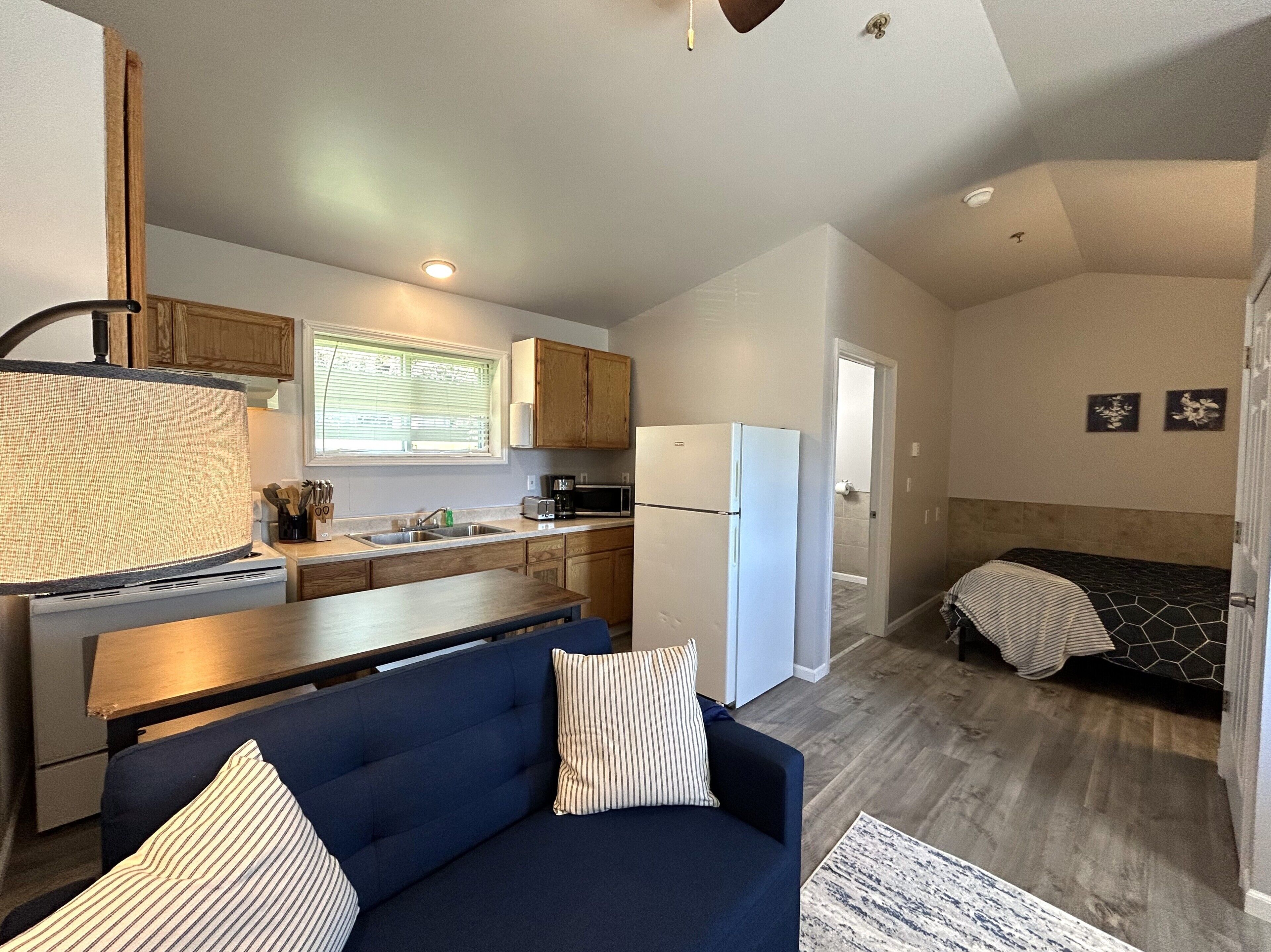 Vacationland Motel #3! This newly updated and freshly furnished motel unit sleeps 2 people in a queen bed and 1 on the twin sofa sleeper. The Vacationland Motel is located downtown St. Ignace, roughly .2 miles from the Mackinac Island ferries! These units conveniently feature a full-size, fully equipped kitchen, dining area, seating & TV area, and a semi-enclosed bed area. Watch the fireworks, or step down into the grassy lawn to watch any local parade come down the main drag Extended stays are welcome!