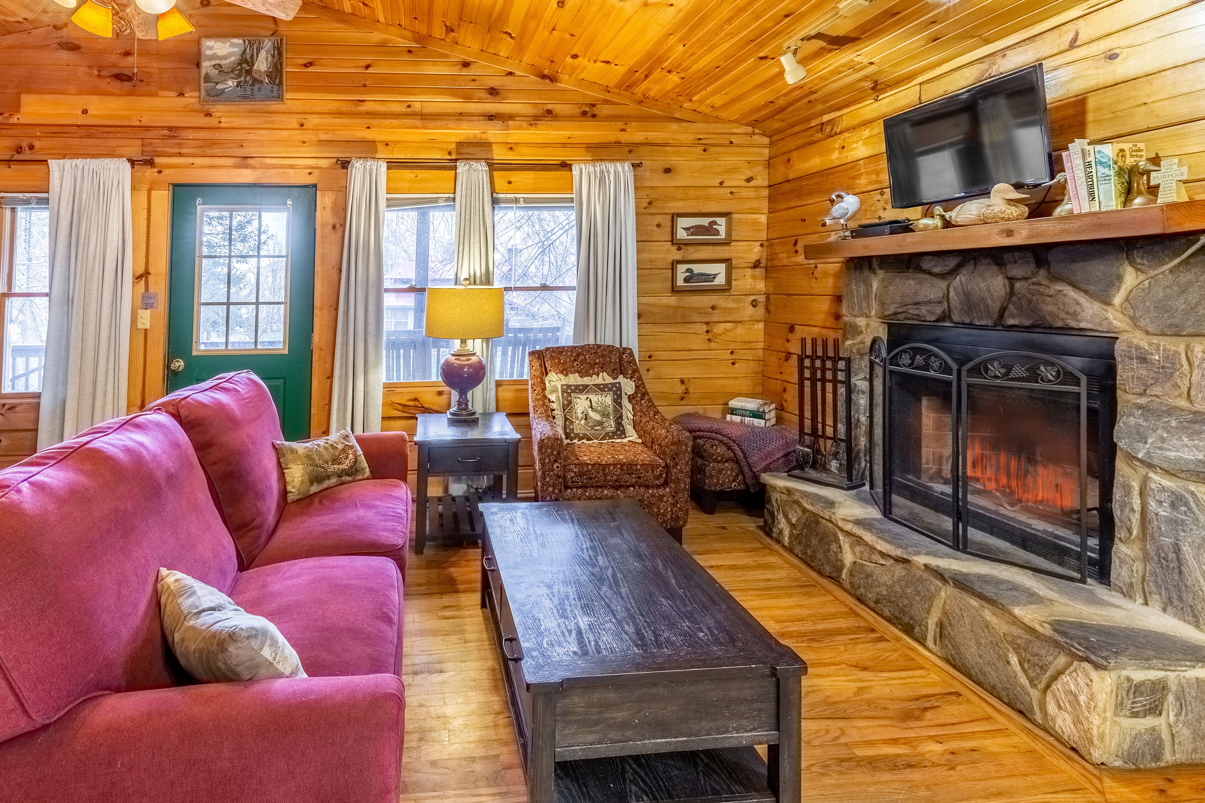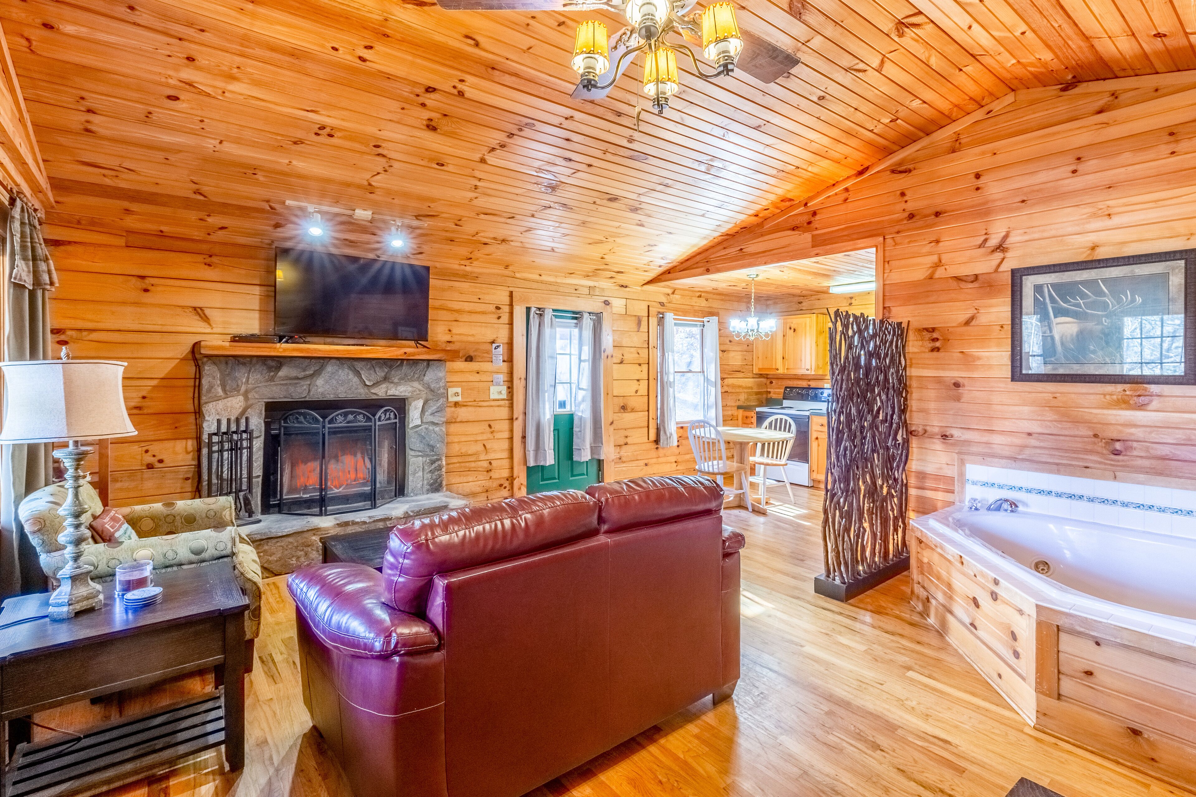 Inside this dog and family-friendly retreat, you will come across an inviting open floorplan with a wood-burning fireplace, large flatscreen TV with cable, a jetted tub that is perfect to treat your sore muscles after a fun-filled day, a well-equipped kitchen with all the essentials plus a two-person dining table, central air conditioning throughout, and a full bathroom with a standalone shower! The front porch offers rocking chairs and a porch swing overlooking the spring-fed pond. Come stay at this charming studio-like cabin and enjoy a perfect location in the heart of Maggie Valley with very easy access all year round!