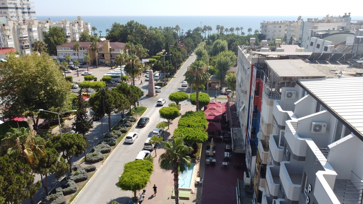 There are two balconies accessed through three doors, with views in all directions. The roof terrace above it can also be used. The balconies afford a lovely view as far as the 3000-metre-high Taurus mountains. To the side about 300 metres away one can see a small section of the Mediterranean Sea.