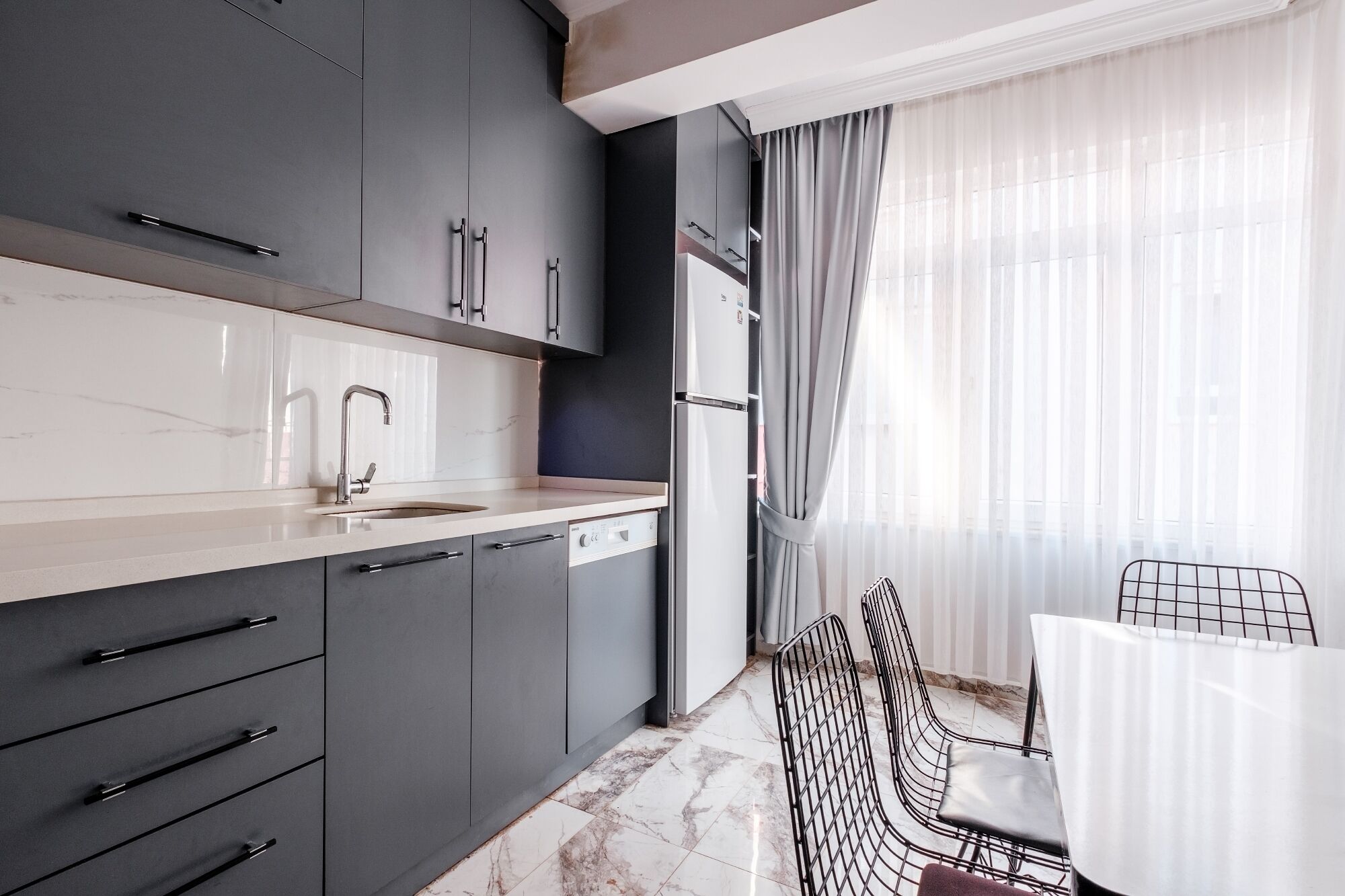- Kitchen-dining area: Dining table, built-in appliances, crockery, cutlery, set of pots, frying pan, kitchen trifles.