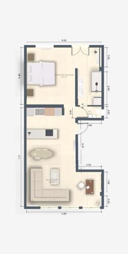 The fully-equipped kitchenette merges with a cozy living room, with air conditioning, a sofa, and a TV for your enjoyment.