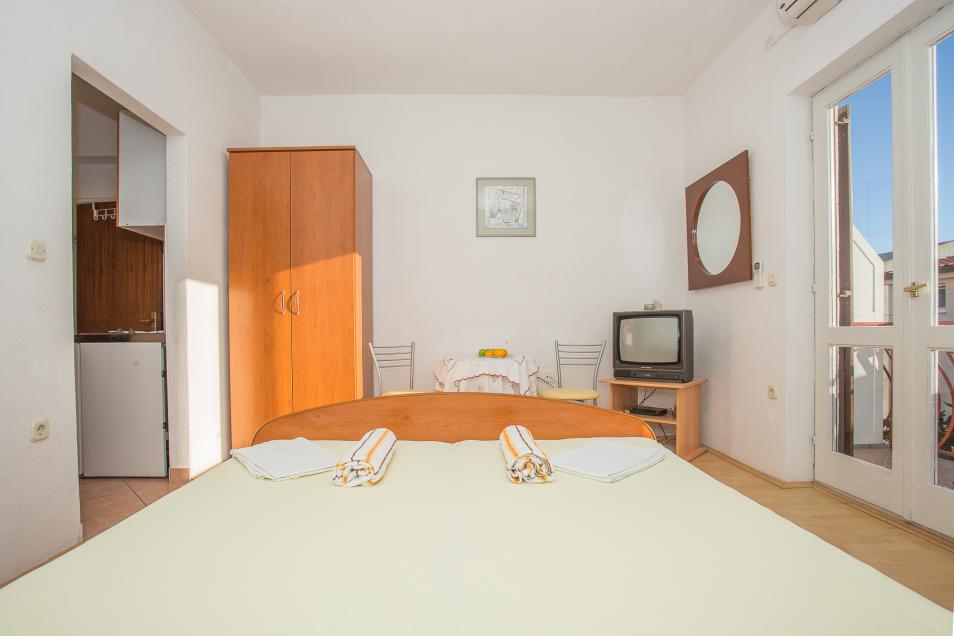 This studio - apartment have one comfortable bedroom with double bed and a balcony with a sea view. Also there is fully equipped kitchen witch make your stay more comfort, double bed and TV.