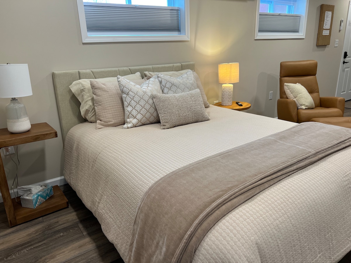 This cozy apartment enters through a shared hallway and has been recently updated from floor to ceiling with new cabinetry in the renovated kitchen and bathroom. Full kitchen with granite counter tops, full refrigerator, stove, microwave and Keurig. Full bath with shower unit. Bedroom offers new queen size mattress, large closet with luggage rack and cubbies. Desk with comfortable office chair for our business travelers.
