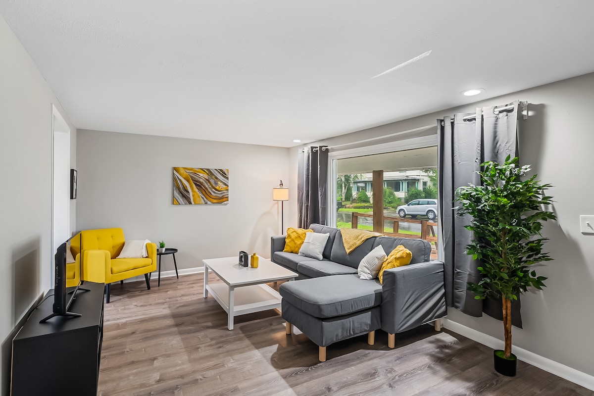 Welcome home to our gorgeous, newly remodeled apartment, our personal home and kept immaculate for you! Relax in the zen-like, light-filled living room with 55" TV. Large bedroom has a desk and tv. Air and heat in each room. Kitchen includes DW. Large bathroom with tub, shower and compact W/D. 1 block from OhioHealth Hospital, 3 mi from Ohio reformatory, and 9 mi from the mid Ohio Car Course. Unit is upstairs and may not be suitable for people with mobility difficulties or small children.