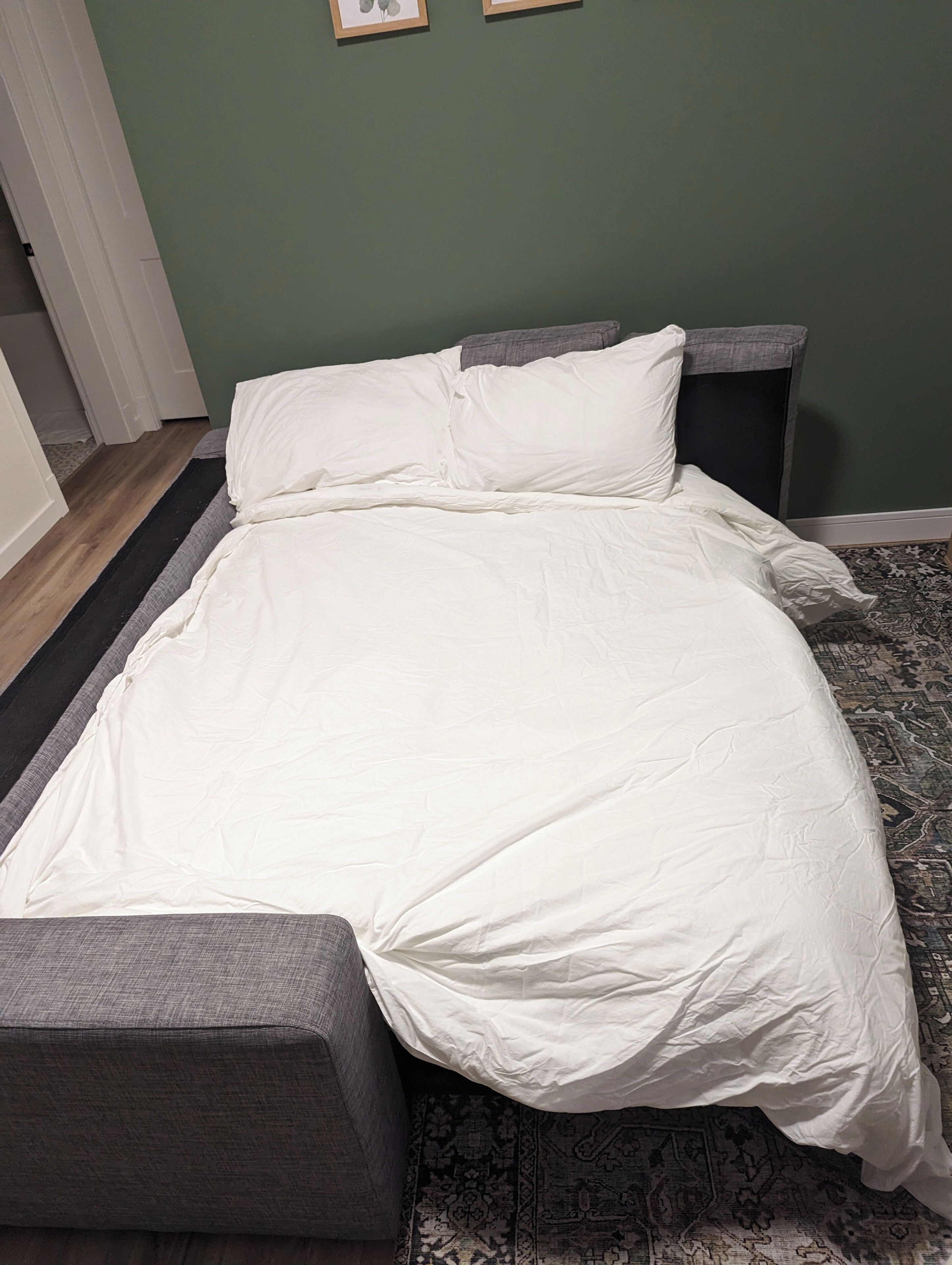 - There is a queen size bed and a futon sofa that can fit an adult for sleeping (3 adults in total).