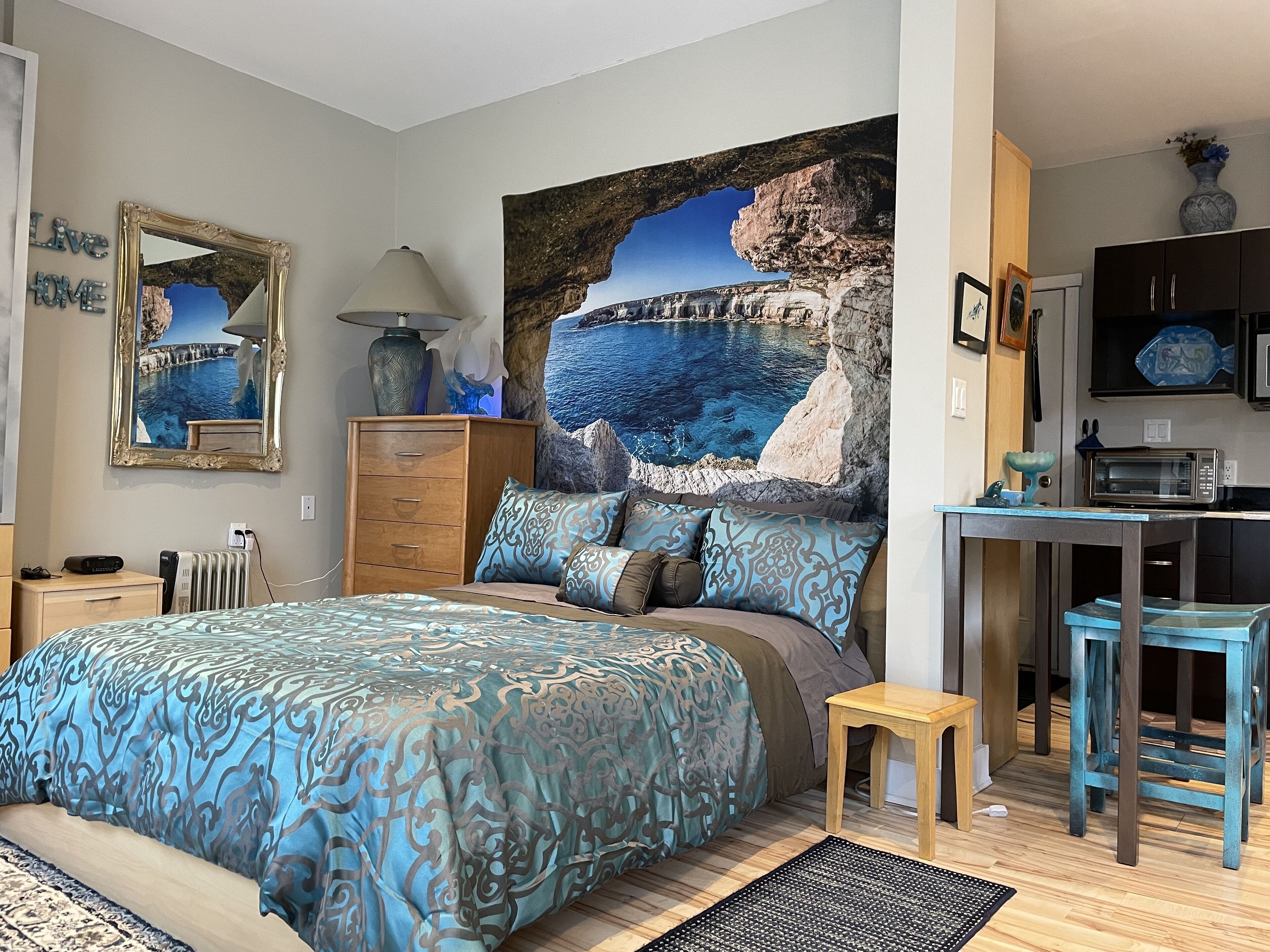 An ocean theme away from the ocean. This place is tastefully decorated, quiet and central. Close to creek water that runs close by, birds and a large green area with cedar trees. It’s close to the city core, restaurants and business. The leisure center is within 10 min walk. In the middle of nature for rest and central for shopping makes this place ideal for travel.