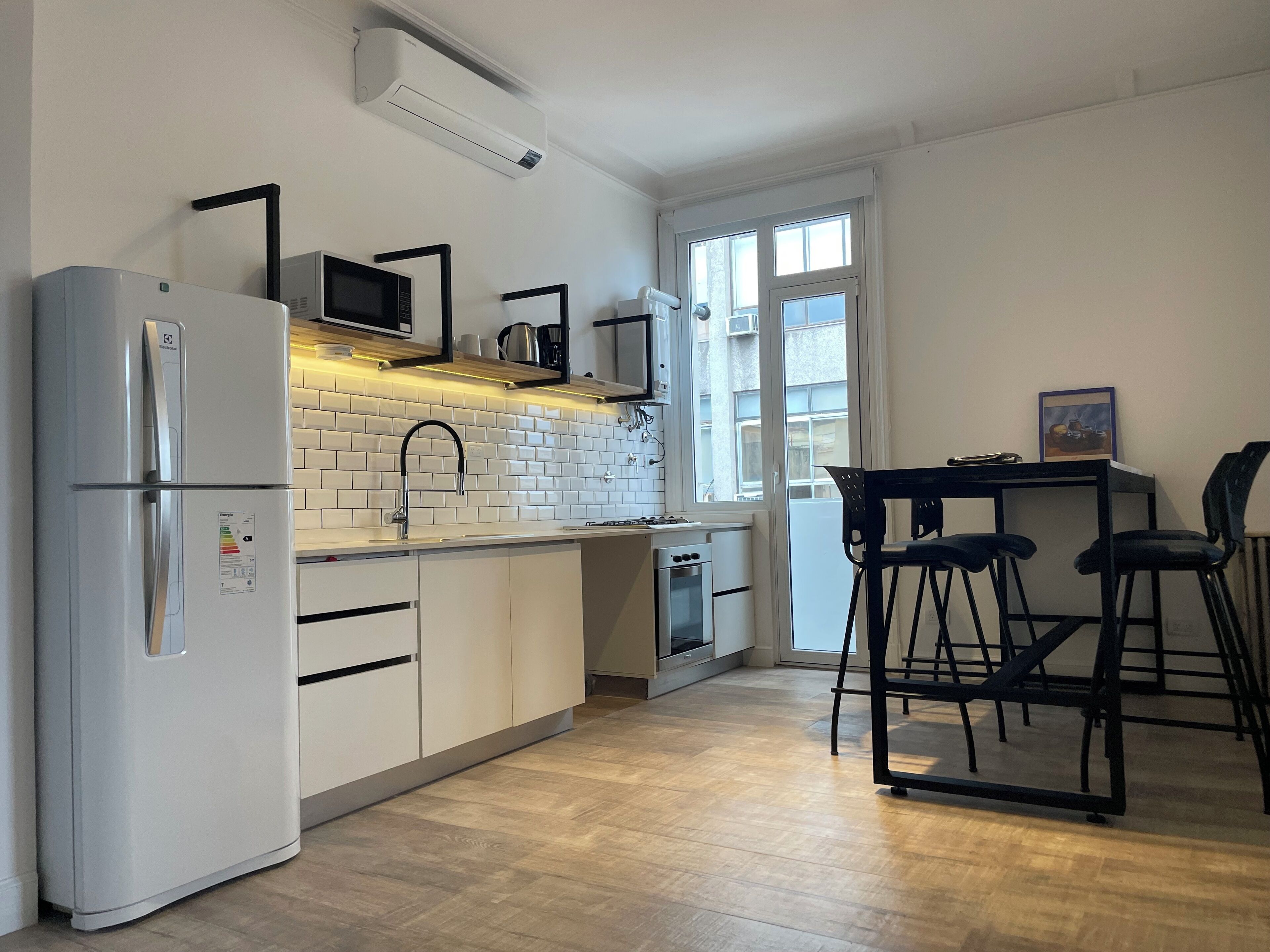 Street view apartment equipped with dining room, kitchen, bedroom, and bathroom. We have a double sofa bed and a large and comfortable sofa bed. The building has 24-hour camera surveillance