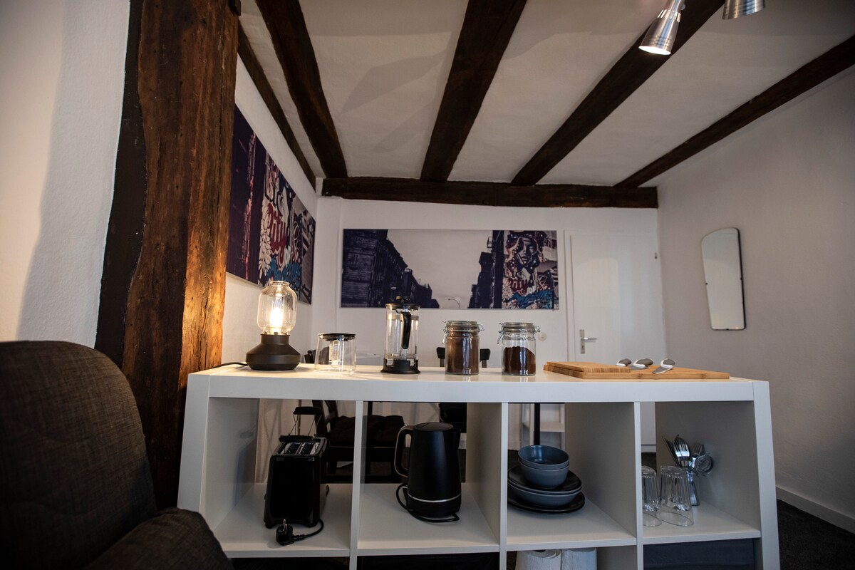 In the anteroom there is a kitchenette in which a microwave with grill & oven as well as a fridge, a kettle and coffee pot, dishes are available (see pictures). The extensive culinary offer of the city for every budget leaves nothing to be desired. Already on the ground floor is a great pub restaurant. On the second floor there is a toilet. On the floor of the room there is also a renovated shower room, here you will also find a washing machine and a dryer. The house consists of 10 parties/rooms, most of which are rented through Airbnb. All bathrooms are shared. A coin counter charges for the use of the shower (0.50€/3 minutes hot water) and the washing machine (4€/wash). Dryer use is included.