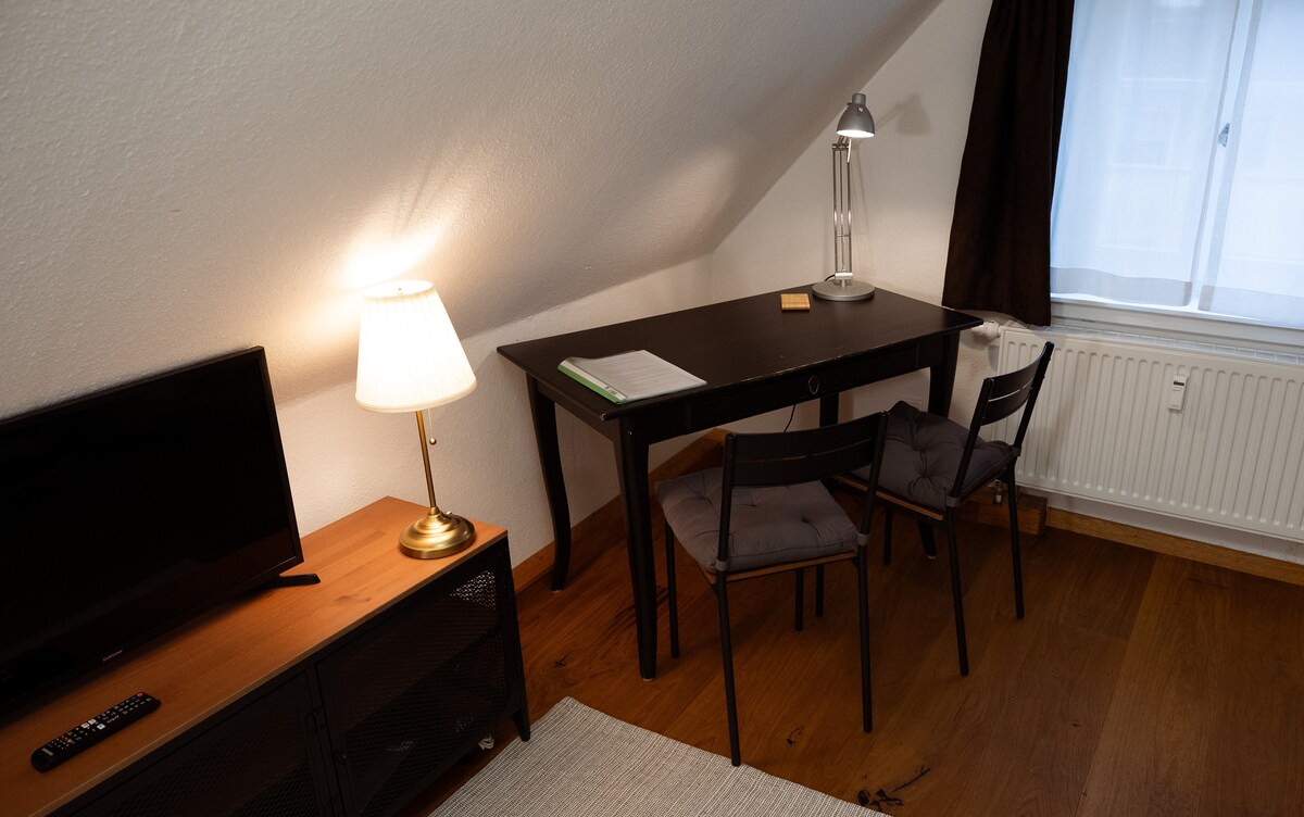 The room consists of a living/sleeping area and can accommodate a maximum of 2 persons (on a sofa bed 140x200 cm). In addition, the room has a table with two chairs, which can also be used as a desk.