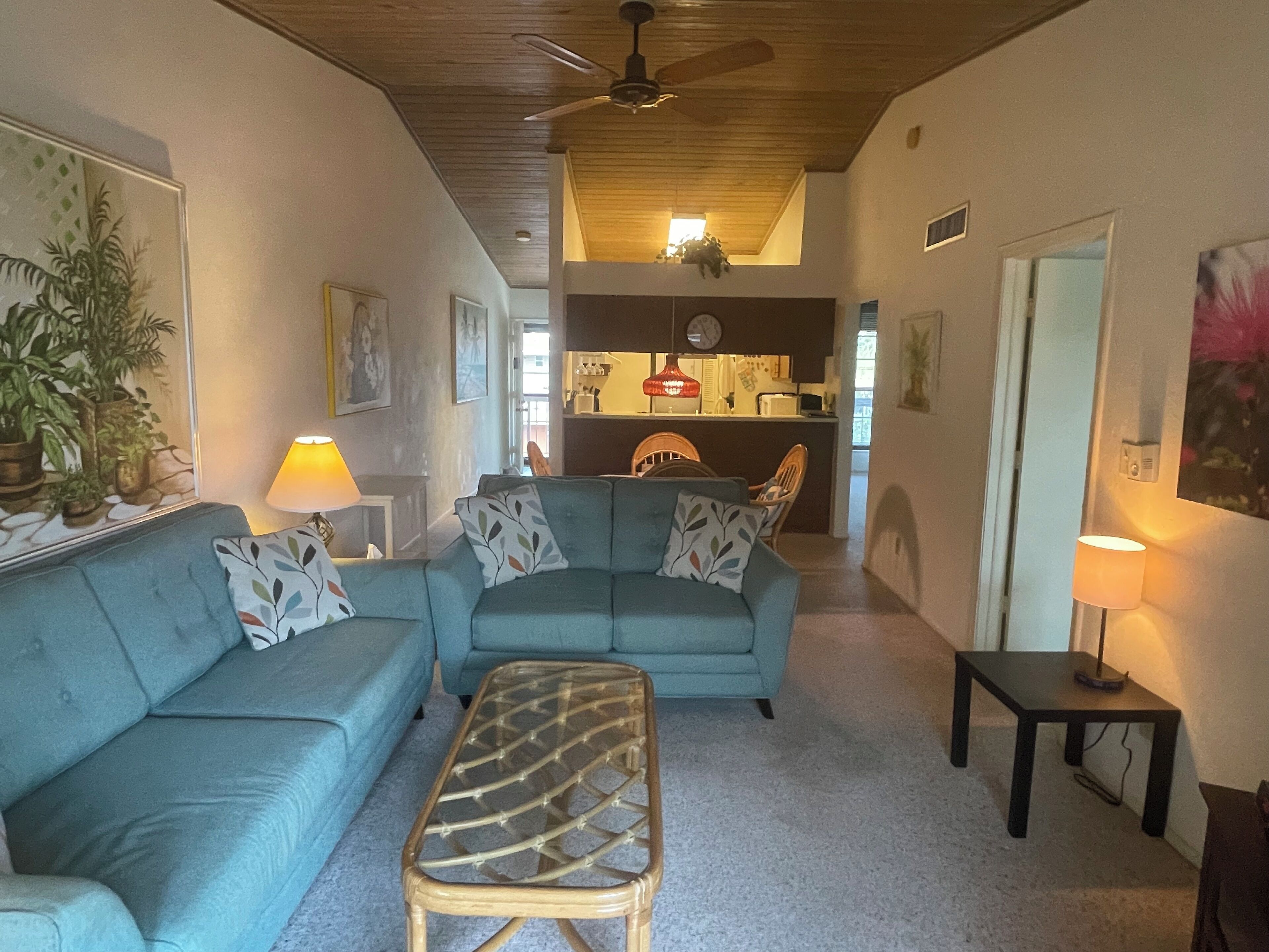 This corner unit has plenty of natural light and is meticulously cared for. Each room, including the living room, has its own ceiling fan, AC unit and smart TV for your comfort and entertainment. The unit features a king bed, a full bed, and a full-sized sofa bed, all with extra linens provided. The bathroom is stocked with basic essentials. The kitchen comes fully equipped with appliances, dishes, wine glasses, a coffee bar, and more. The spacious rooms also boast ample closet space, making it easy to settle in. This unit is the perfect place to relax and unwind!