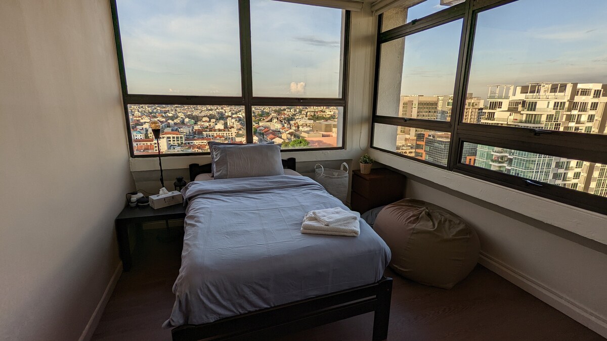 The room is located on a high floor, with breathtaking views of the Katong neighborhood. Wake up to beautiful sunrise scenes each morning in the comfort of your bed! #nofilterneeded