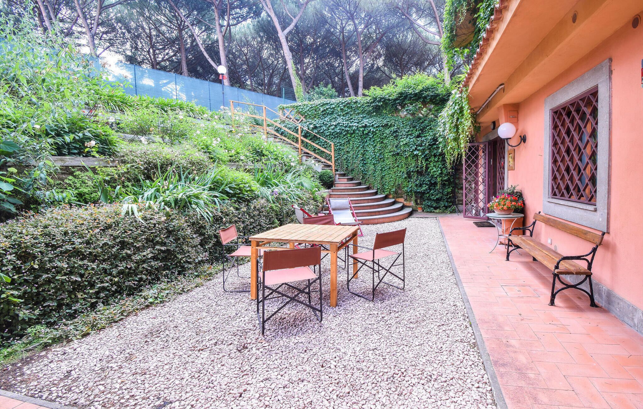 South of Rome welcomes you this charming vacation apartment surrounded by a pine forest. The high-quality and lovingly decorated interior makes a tasteful impression and provides an atmospheric setting for your comfortable vacation. Spend sociable evenings in the spacious living room, where you can warm yourself in front of the fireplace during the cool season. Also enjoy your time on the terrace overlooking the pretty flower beds and the pine trees.