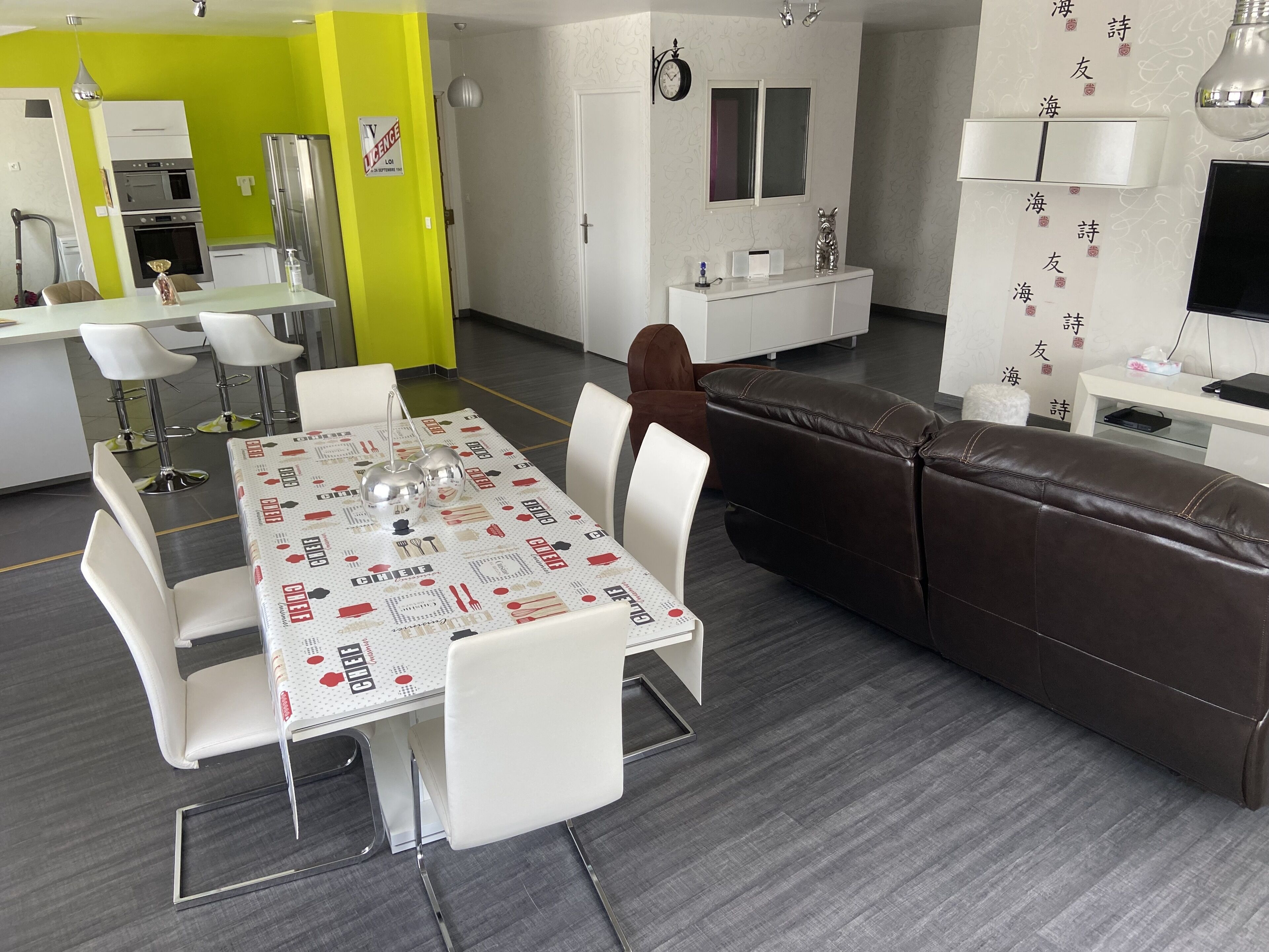 La cuisine est équipée d'une plaque induction, lave-vaisselle, cafetière Nespresso, machine à laver et sèche-linge, smart TV et wifi et climatisation.