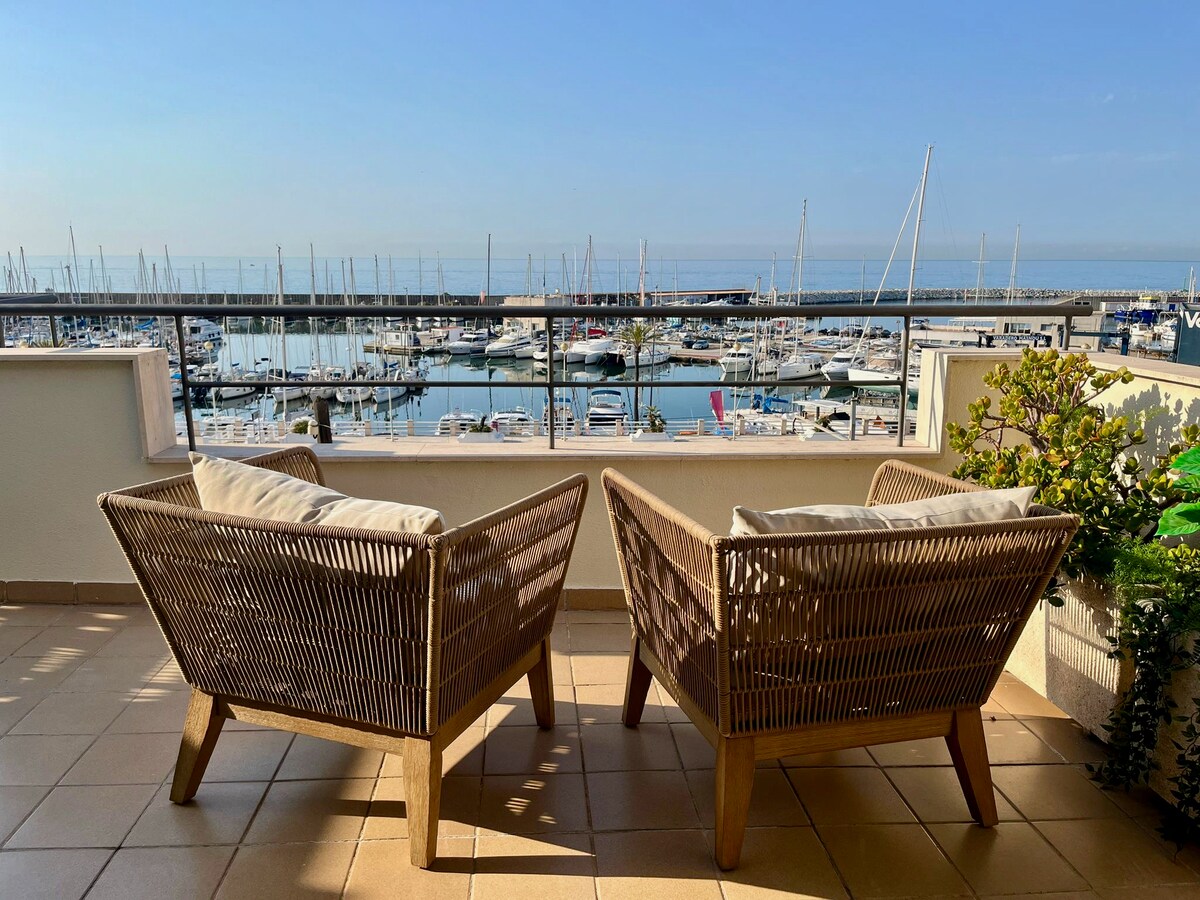 The spacious private terrace overlooks the port and is equipped with a table, lounge chairs, and a barbecue – ideal for relaxing.