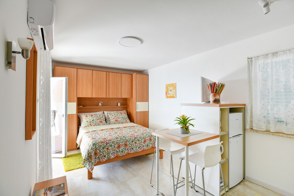 Studio flat can accommodate 2 guests. Beds are situated in 1 sleeping rooms, within 23m2. Guests can enjoy a sea view from the private terrace. Food can be prepared using barbecue which is shared with other guests too. This accommodation unit welcomes pets at no additional costs.