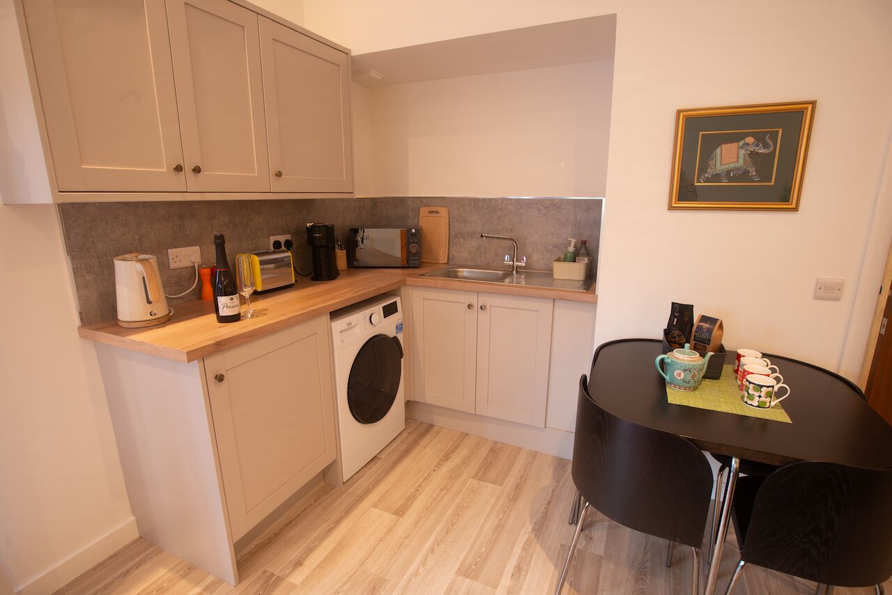 Kitchen with electric oven, induction hob, washing machine, integrated fridge/freezer (3 drawer), small dishwasher, microwave, Nespresso machine, dining area with seating for four. Small wall-mounted TV.