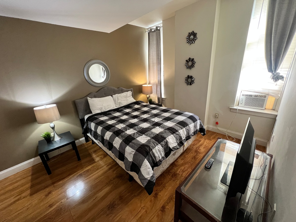 Cozy 1 bedroom unit near the University of Memphis. Premium king size bed, and queen sized sleeper sofa. Full kitchen with all appliances, Keurig and drip coffee maker, blender, utensils. 55 inch Roku TV with high speed internet. Very walkable neighborhood. This is the front half of a duplex - the rear unit is occupied by a long term quiet tenant.