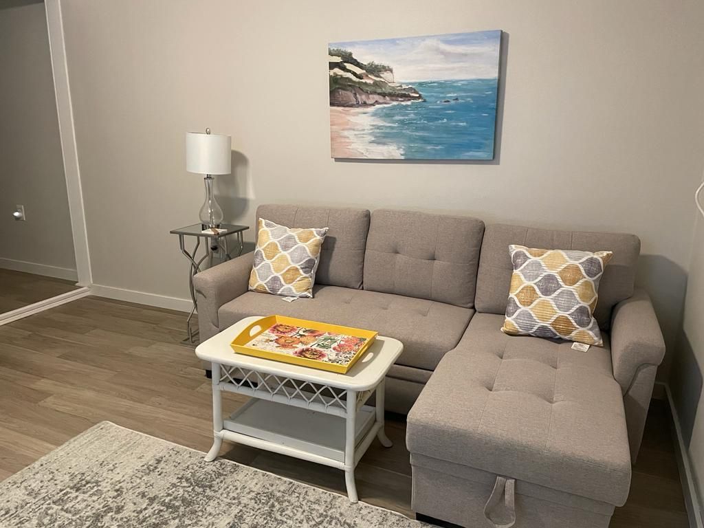 Unit is very clean. Brand new Queen mattress and sleeper sofa, kitchen accessories to satisfy short or long term stay, washer/dryer are brand new and full size.