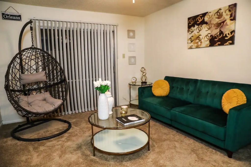 Only a 10 -15 minute uber down the I-10 to the Quarter yet only 5 -7 minutes from the airport. Free parking. Centrally located in Metairie -Target, Walmart, Trader Joes, etc. A handful of 24hr bars within walking distance. The complex itself is gated & requires gatecode. Machine operated washer & dryers in the complex. A charcoal bbq grill & outdoor seating downstairs.