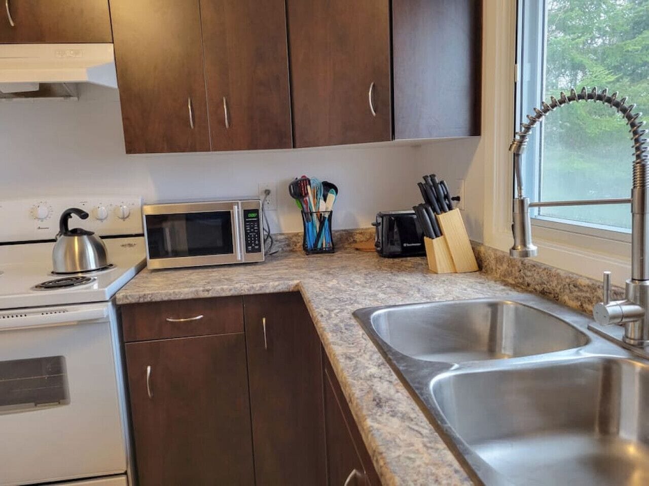 Chez Nous is a newly renovated and completely self-sufficient one bedroom apartment with a balcony located above our garage.