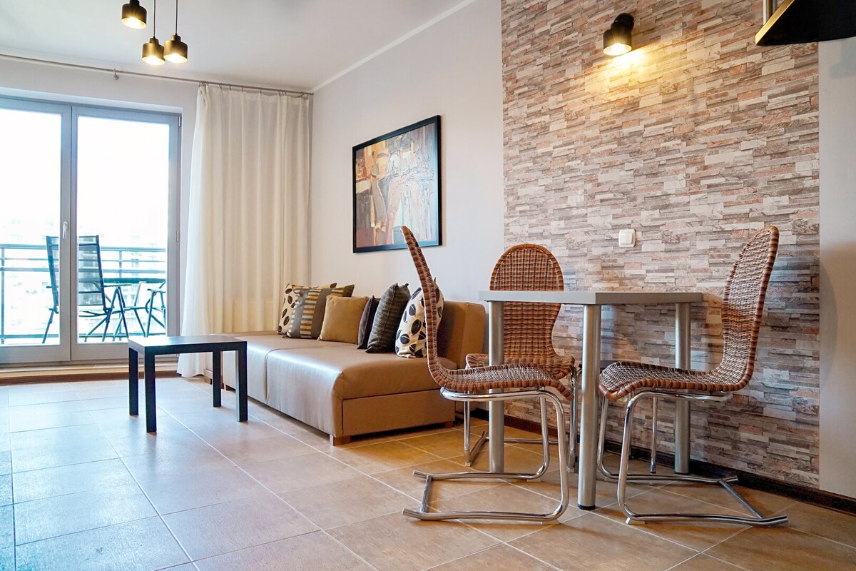 This atmospheric flat is located on the 2nd floor of a modern building. It will be an ideal choice for a romantic trip to the sea, as it has the possibility of accommodating 2 people. The space of the flat consists of a living room with a kitchenette, a bathroom with a shower and a balcony. The flat is distinguished by its modern décor, perfectly selected furnishings and functionality. For an extra charge, guests can also use the gym, children's area, spa area and swimming pool with jacuzzi. The main area is equipped with a comfortable double bed, TV and access to the balcony. It provides the perfect place for rest and relaxation. In addition, stocked with quality appliances, the kitchenette allows you to prepare your favourite meals. A table with chairs will allow you to dine comfortably and have a pleasant time. The flat has access to a large balcony with garden furniture, where you can enjoy a cup of your favourite coffee or tea. The décor of the flat features elegant accessories, bright walls and furnishings in shades of white. This creates an extremely cosy and pleasant atmosphere that will make our guests feel special. Multimedia equipment includes a TV with SmartTV function and WIFI internet access. The flat is stocked with the basics necessary for a successful holiday. A complimentary set of toiletries (soap, shampoo and shower gel), towels and bed linen are provided to facilitate the start of each stay. Your pets will also be welcome, at an additional cost.