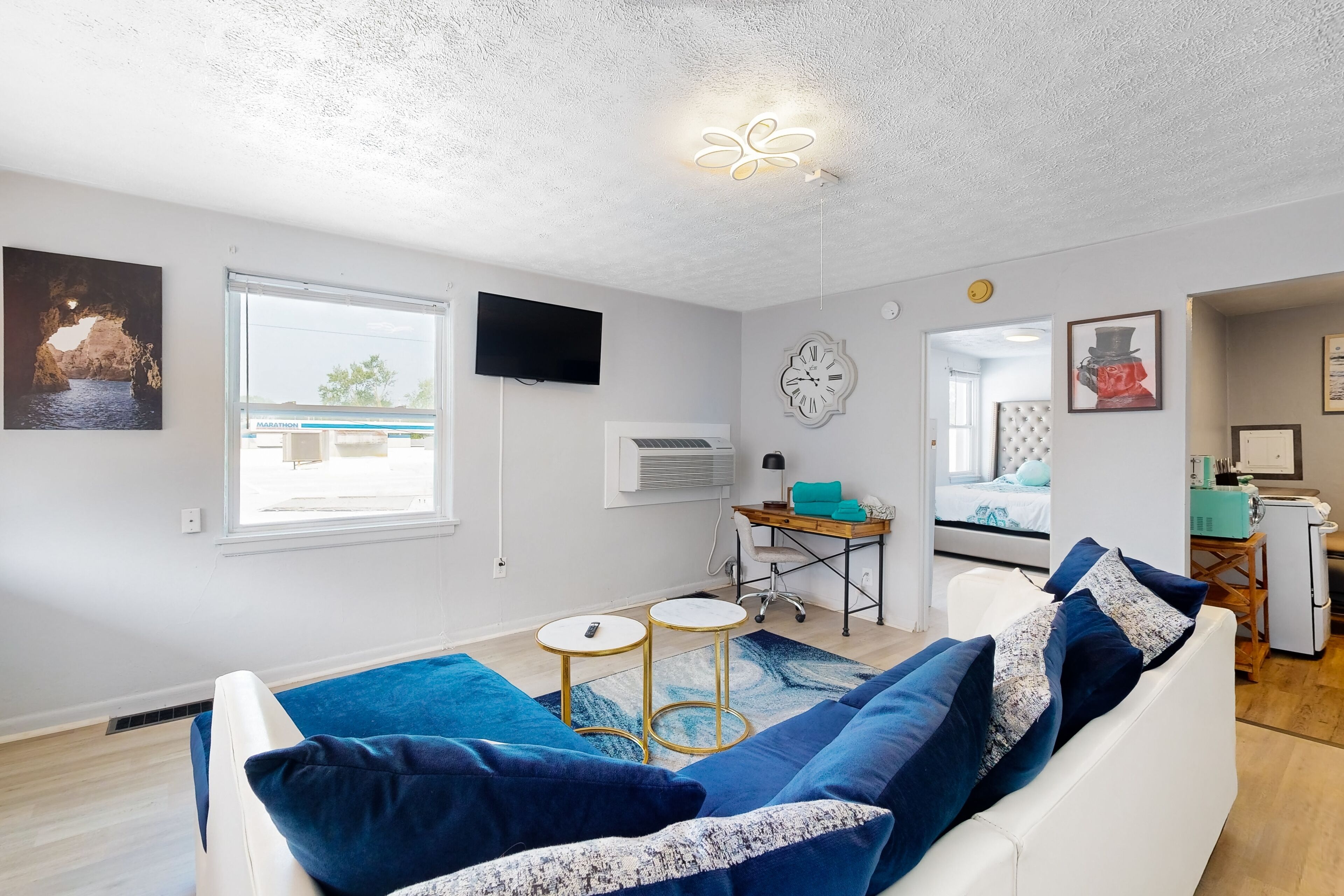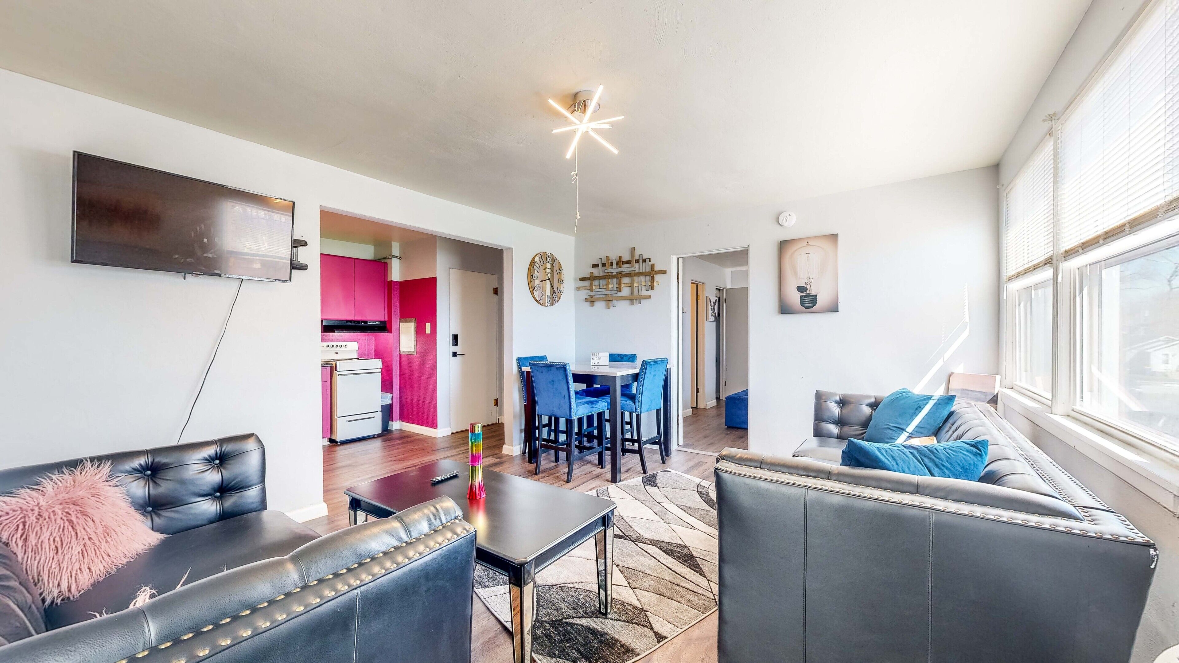 At your recently renovated stay, you will love the vibrant decorations and homey touches. The well-equipped kitchenette provides a comfortable space to cook - if the urge arises. Movie nights can be enjoyed in the bright living room. And remote workers will appreciate having a designated workspace in the spacious bedroom.