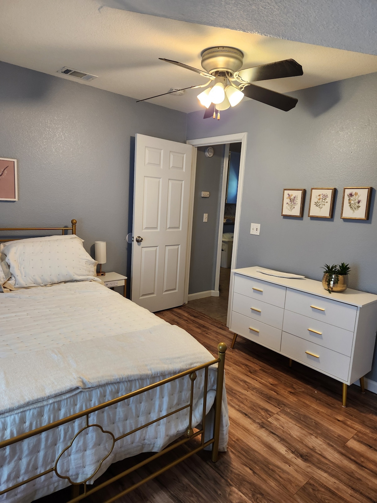 Ceiling fans/lights/ AC & heat are available in each bedroom. Each bedroom has a closet with hangers. An iron & mini ironing board are also available.