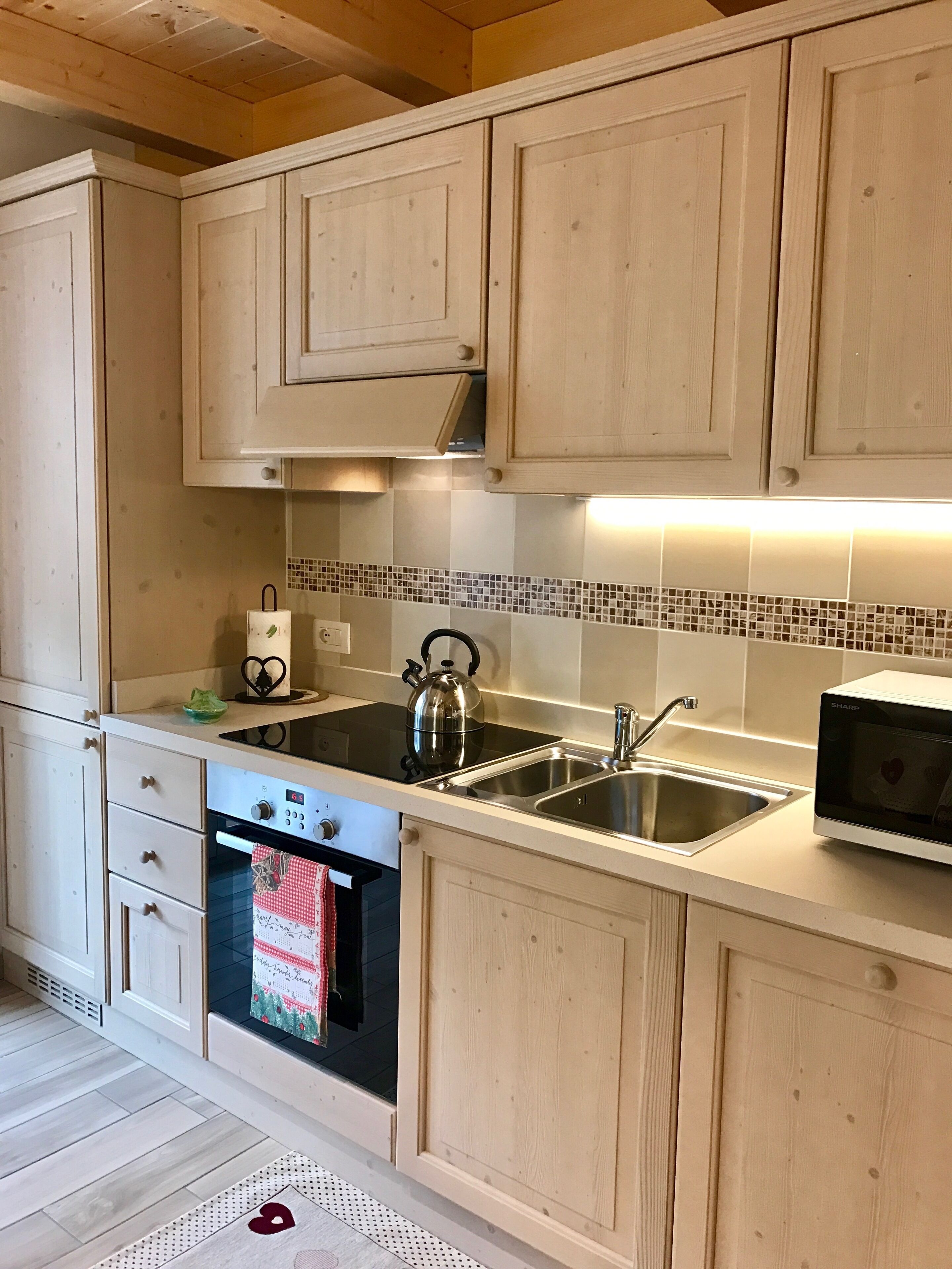 The living area consists of a small kitchen (not served by hot water) with a gas stove and an electric oven and a living room with a small TV, a Tyrolean stove, and a large window from which you can see the lake.